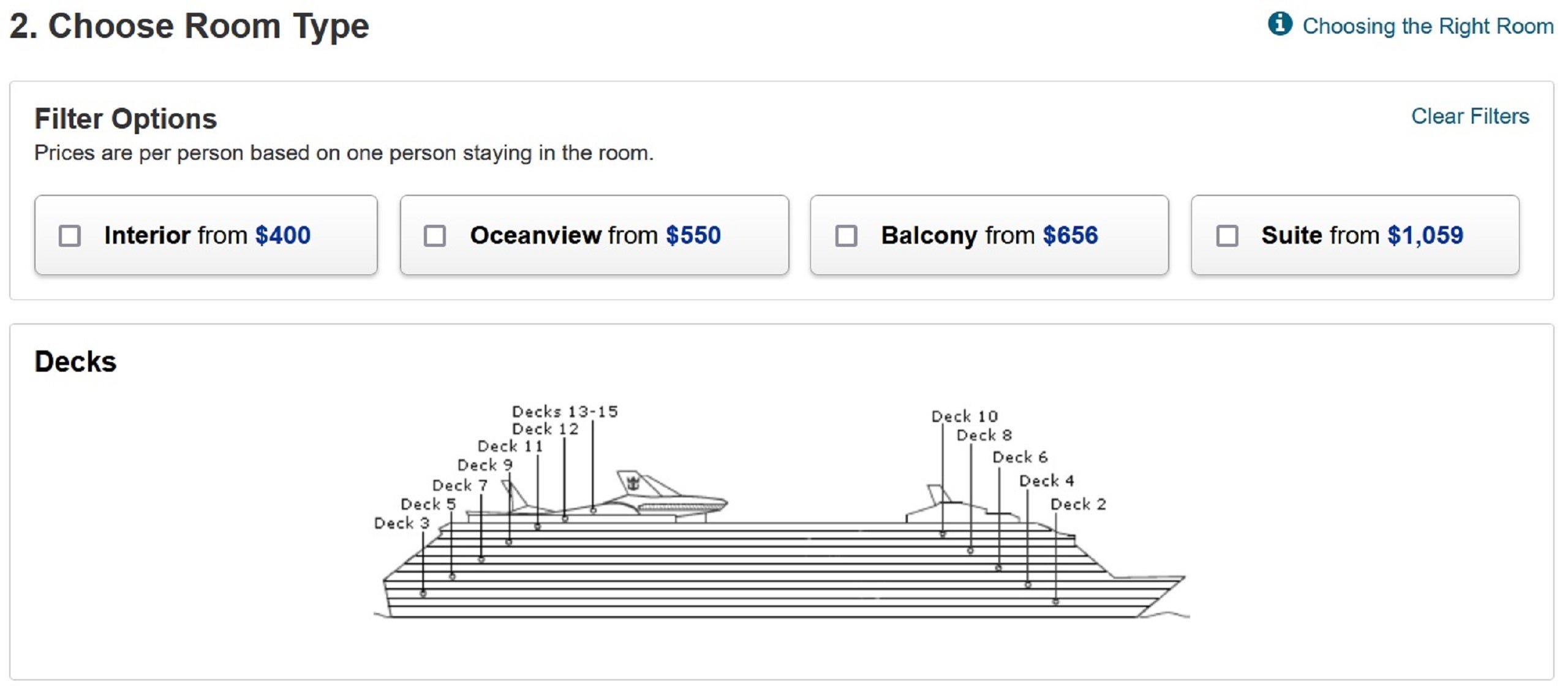 In step two, you'll choose the type of cabin you'd like. On this page, you'll find information about what each room style provides, along with introductory pricing for the least expensive cabin in each category. When you find the room type for you, click the "Select" button under the price. Before choosing, take care to read the fine print, as some cabins have quirks (balconies with obstructed views, for example).
