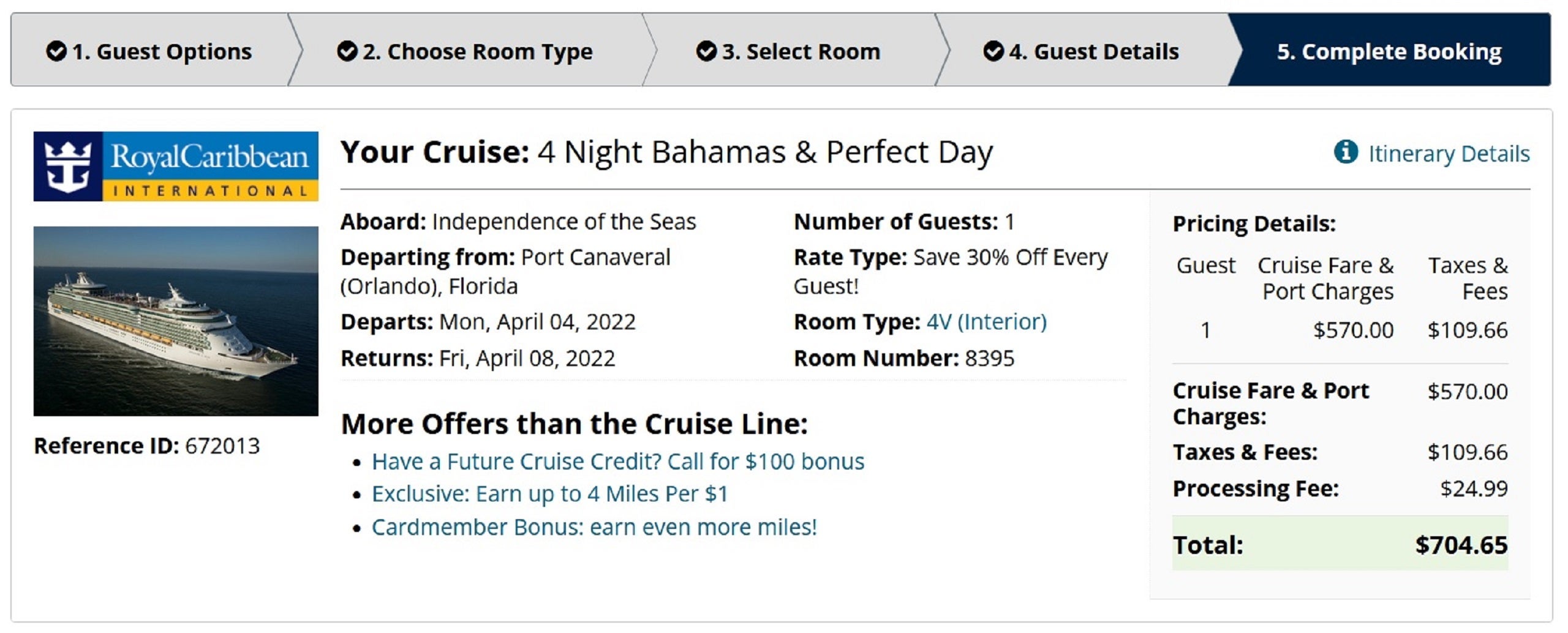 On the final tab, you'll be shown a summary of the cruise you're booking, along with a final price, broken down by base fare and port charges, and taxes and fees. You'll be asked if you'd like to purchase travel protection for your sailing. (I advise purchasing a third-party travel insurance plan for your cruise instead.) On the final page, you'll be asked to enter your payment information, billing address and select whether you'd like to pay a deposit or the entire amount due.