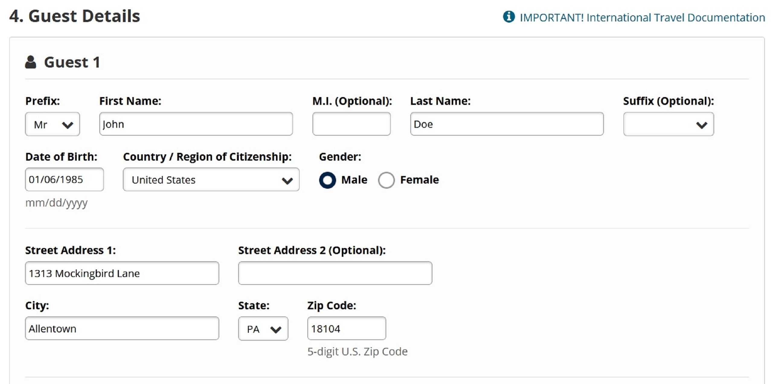 In this step, enter the name, birth date, country of residence, gender and contact information for yourself and each member of your travel party. This is also the section where you'll select your dining preferences — pick a fixed dining time or choose flexible dining, where applicable.