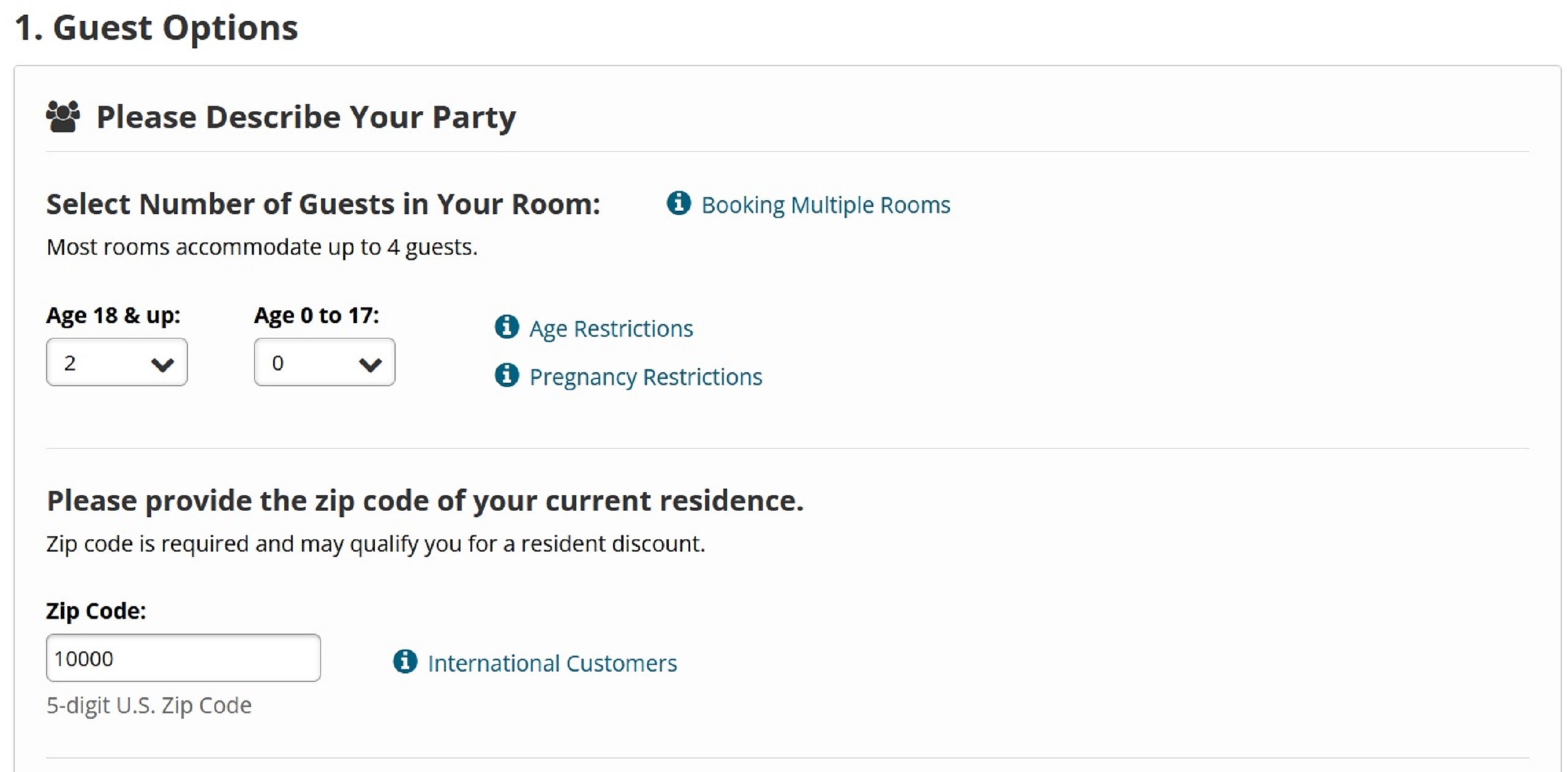 In this section, you'll indicate how many people are in your party and enter your mailing zip code to see if you qualify for any local promotions. You can indicate if you're a repeat cruiser or if anyone in your party qualifies for a senior citizen discount. The form will also ask if you'd like to sign up for emails or use future cruise credits from your cruise line to pay for all or part of your voyage.