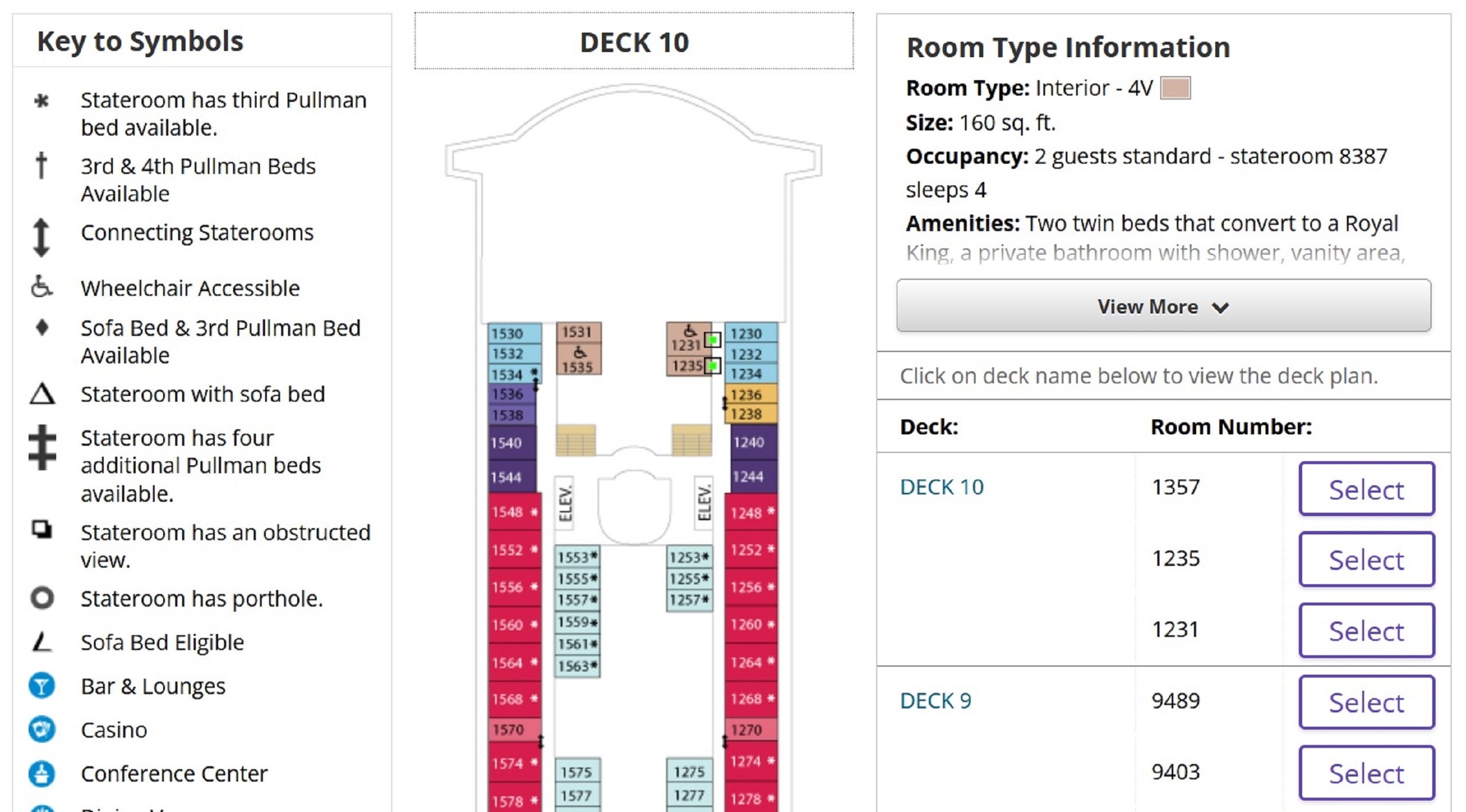 Here, you'll select the exact cabin you want. Use the provided deck plan to see which cabin locations are available, and click the "Select" button next to the room number you've chosen.