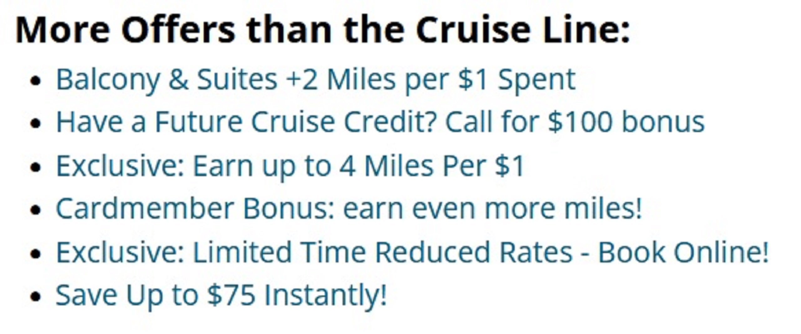 In addition to earning and burning miles, you can take advantage of discounts and perks like reduced or waived deposits, onboard credit and free bottles of wine, offered by some cruise lines. Plus, World Travel Holdings -- the agency that backs United's cruise bookings -- offers a 110% guarantee that you won't find a better deal elsewhere at the time of booking, and you'll have access to 24/7 support if anything goes wrong during your sailing. (That's what the $25-per-booking fee is for.)