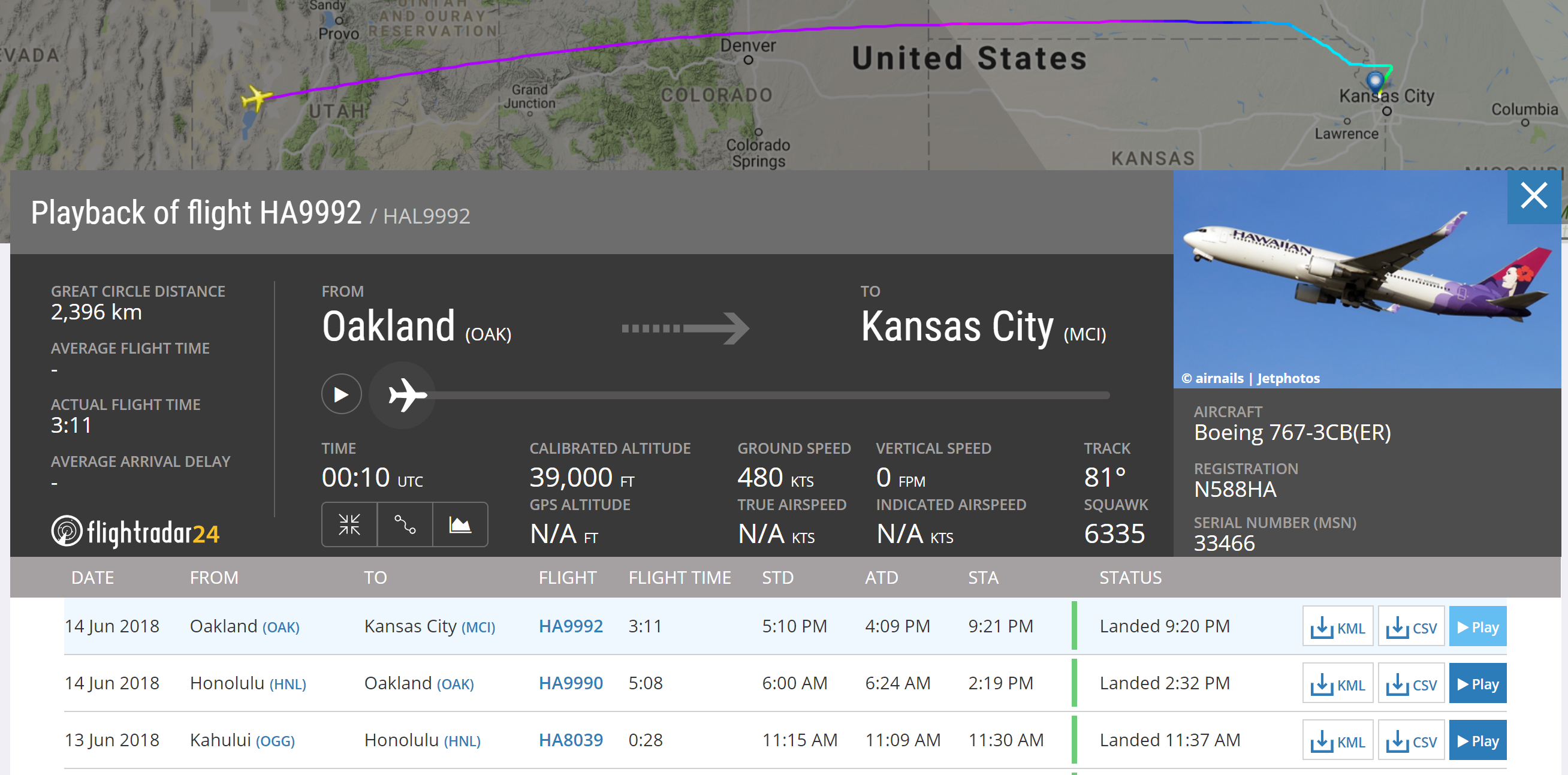 I did a bit of sleuthing and it looks like N588HA, a Boeing 767-300ER, is the first of the three aircraft to be sold to United. The 16 -year old aircraft was ferried from Kahului (OGG) to Honolulu (HNL) to Oakland (OAK) to Kansas City (MCI) and "stored" on June 14. After paperwork was complete, it was likely officially delivered to United on Tuesday.
