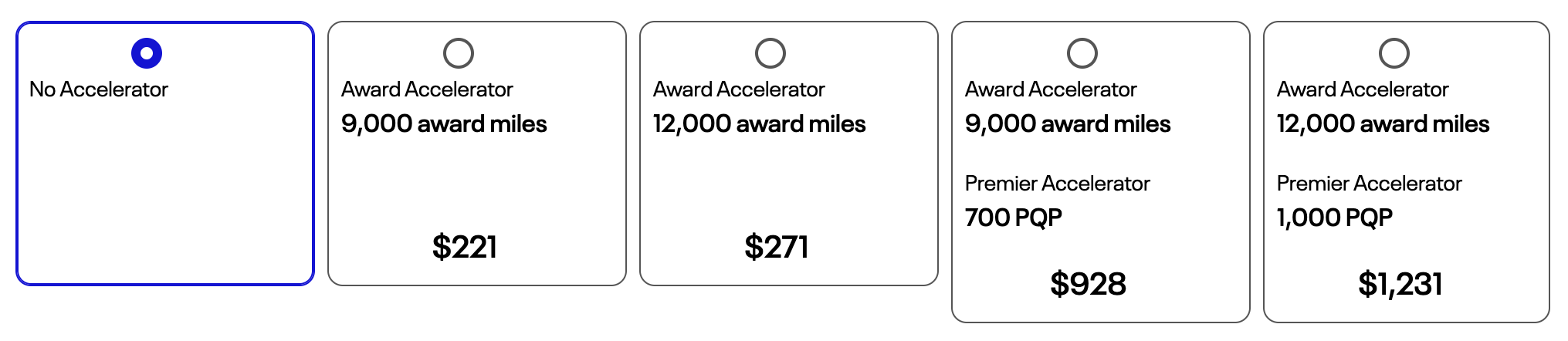 The price varies (and sometimes increases toward the end of the year). Note that only the last two offers shown below include PQPs, and they are not cheap. If you look at the price difference between the packages with and without the PQPs, you'll note that you are paying almost the same amount per PQP as you would if you were buying United tickets to actually fly.