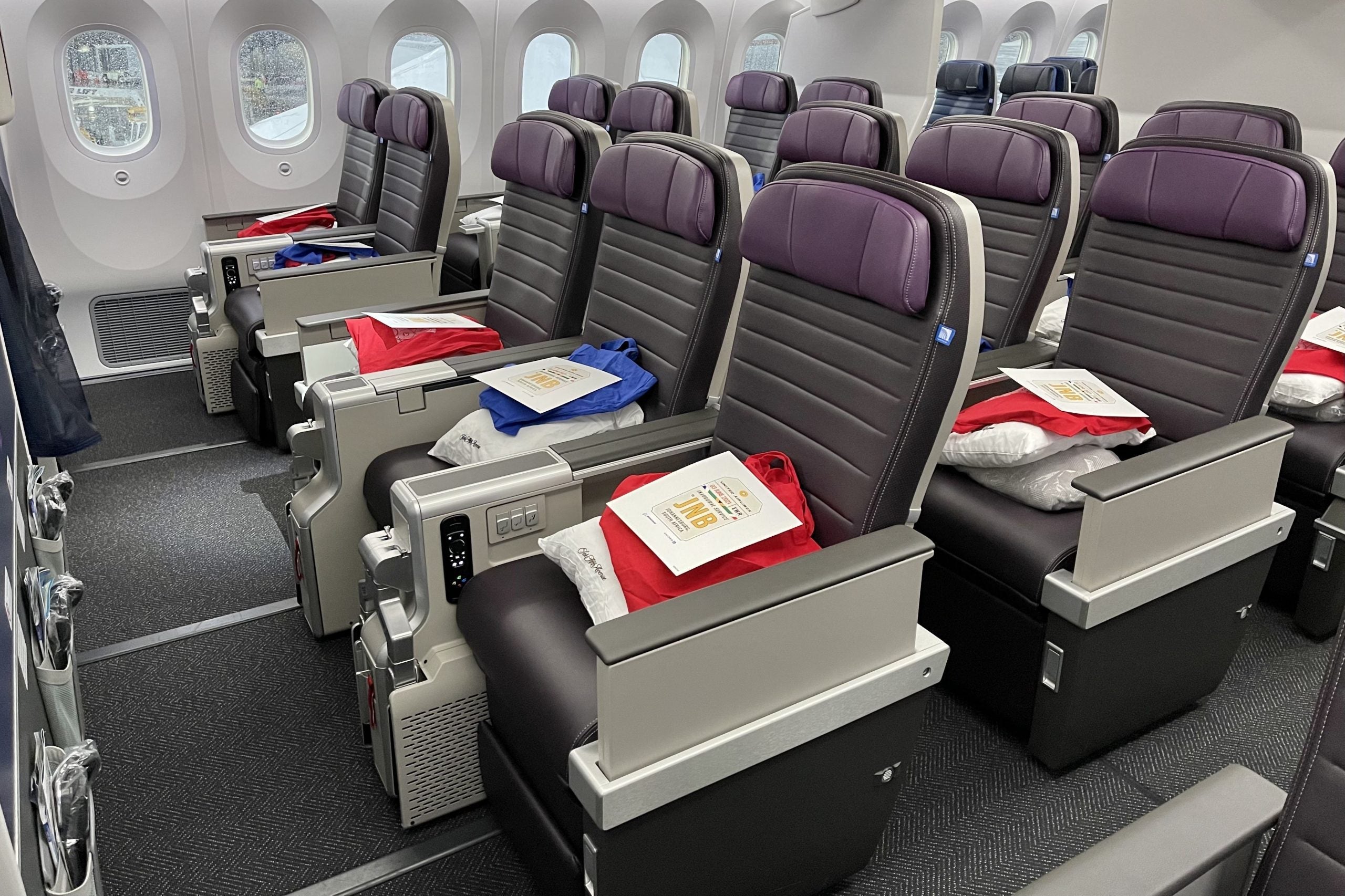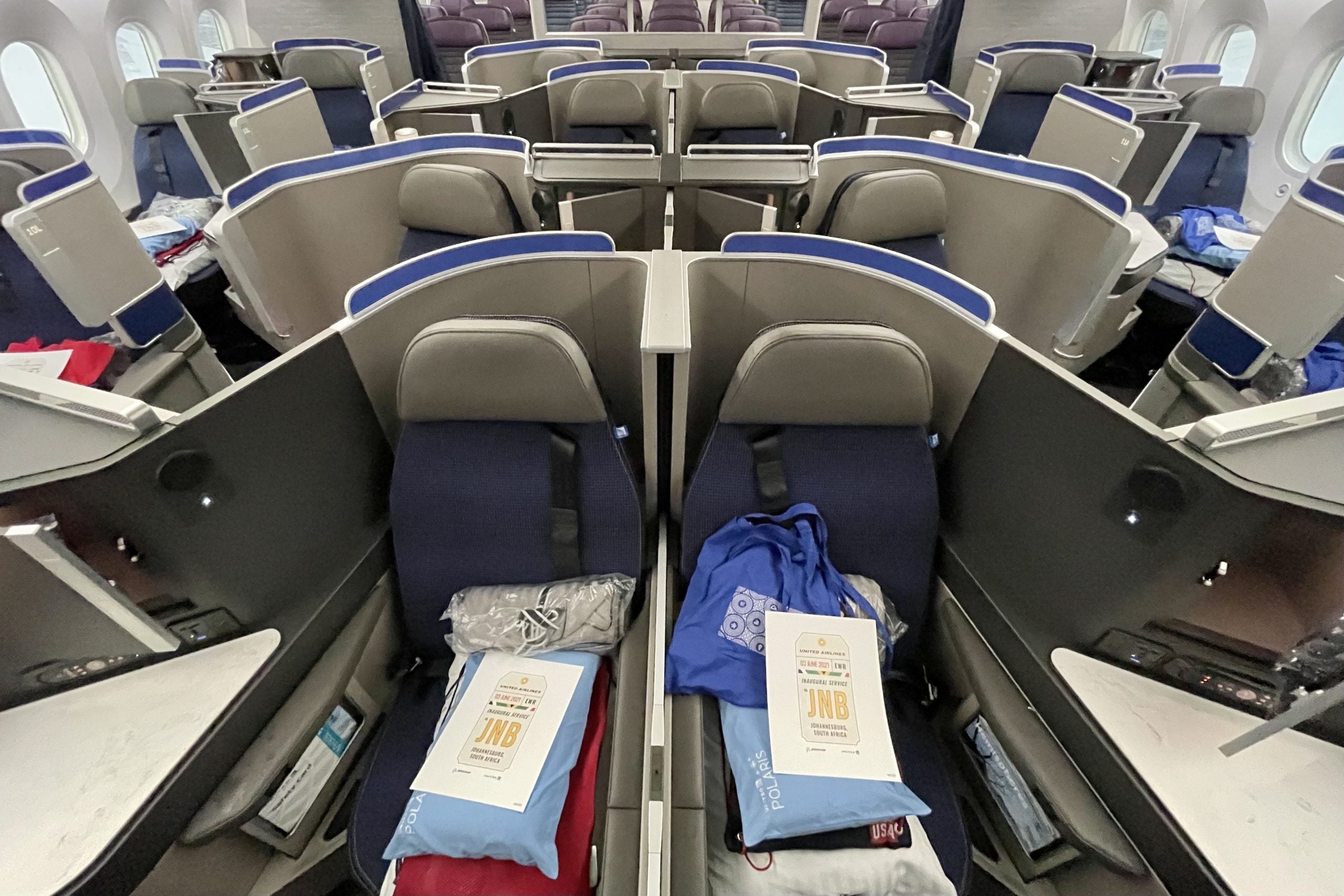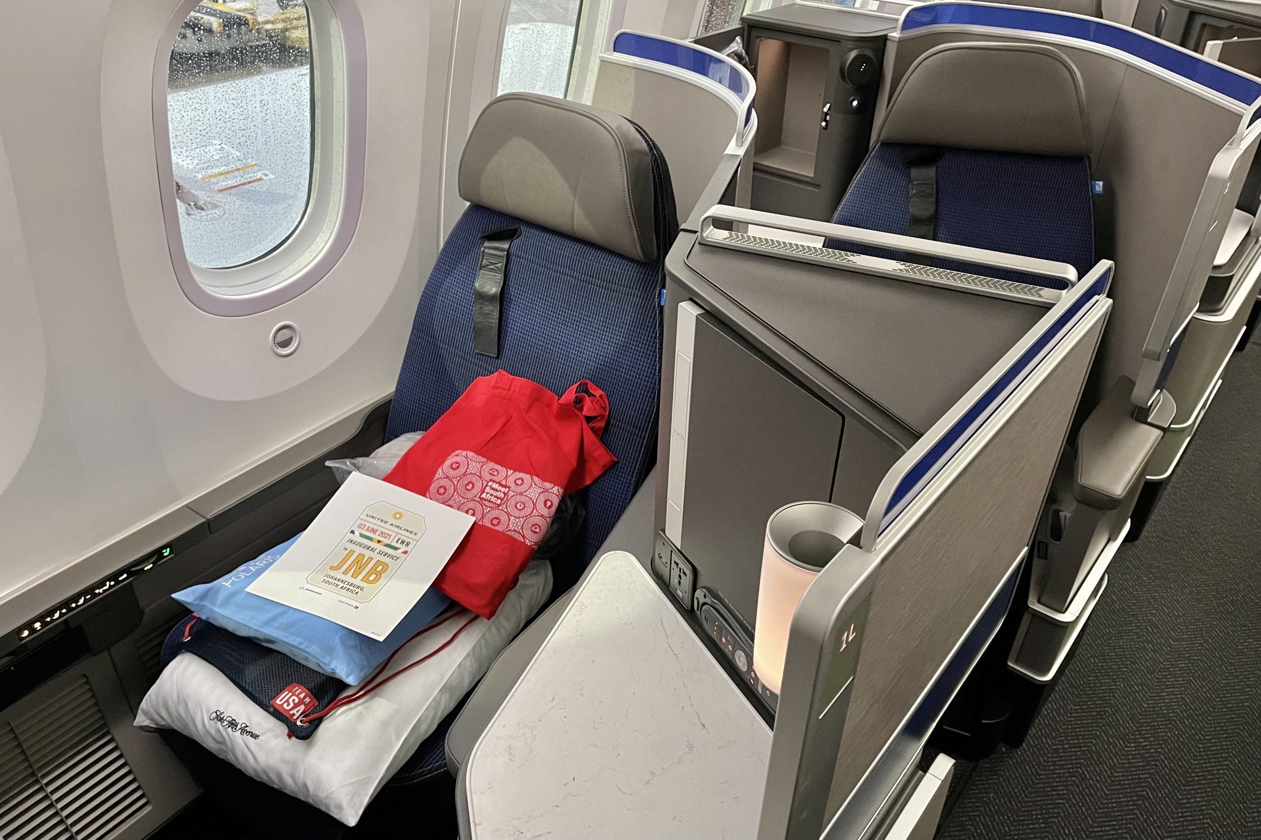 Most notably, the Newark-Johannesburg route is guaranteed to be operated by United's latest Boeing 787-9 Dreamliners. While my Cape Town flight had the old 2-2-2 seats, pictured below, everyone gets the "real" Polaris on the trip to JNB.