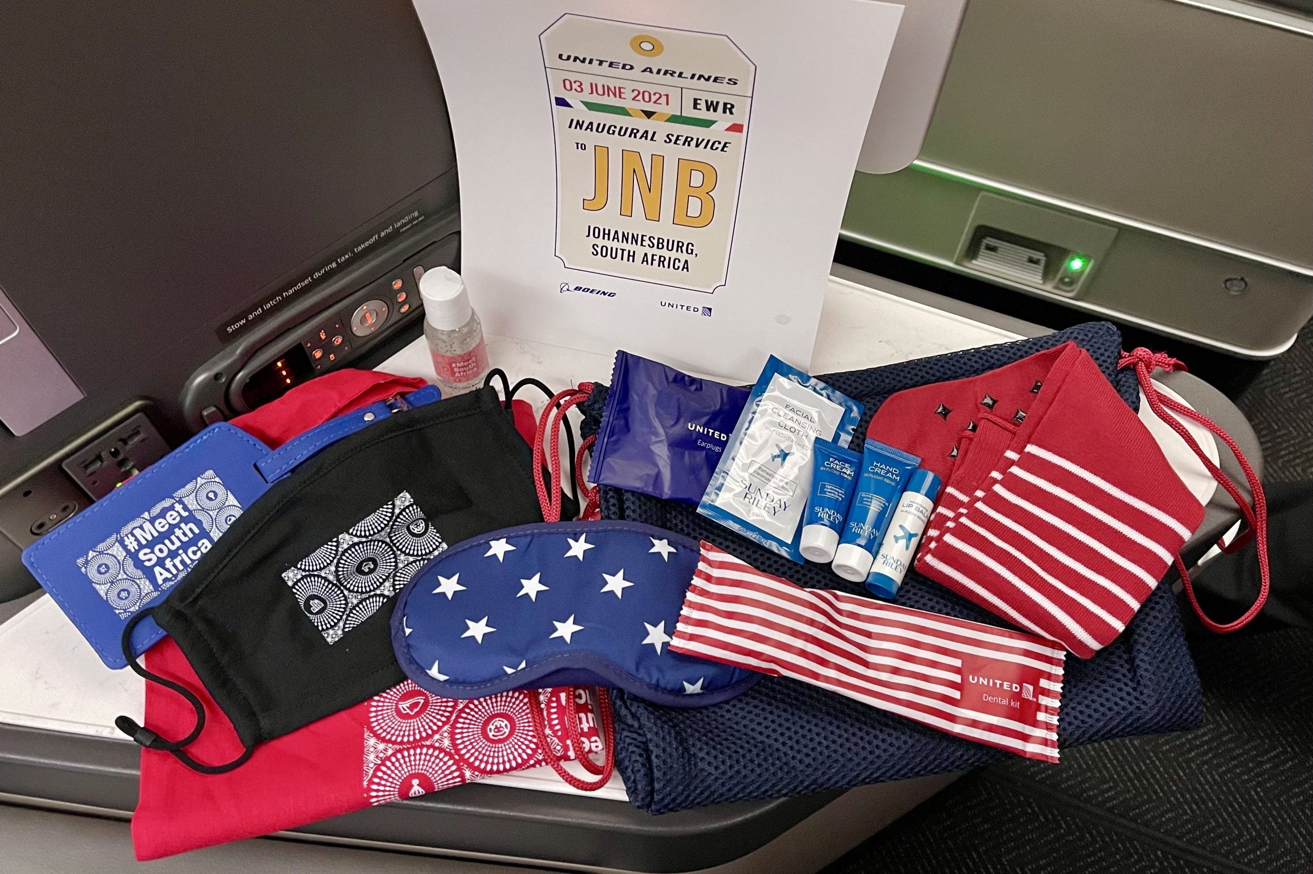 In addition to the usual amenity kit, which included a handy travel bag, a sleep kit, tooth brush, socks and Sunday Riley products, each seat had a South Africa-themed set, including a luggage tag, hand sanitizer and a face mask.