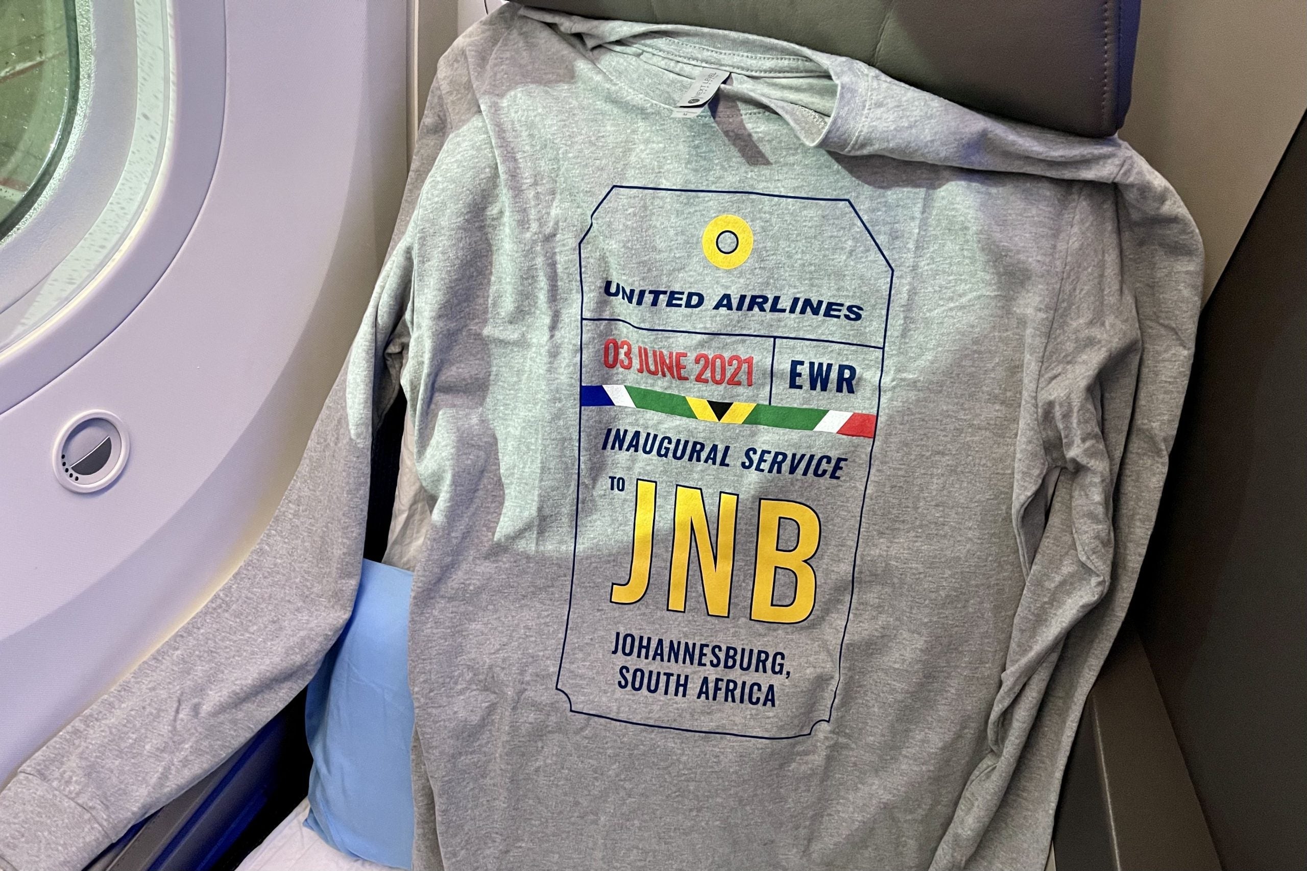 I actually got two pajama tops — United designed special inaugural flight shirts to mark the occasion, which flight attendants distributed to everyone flying in business class.