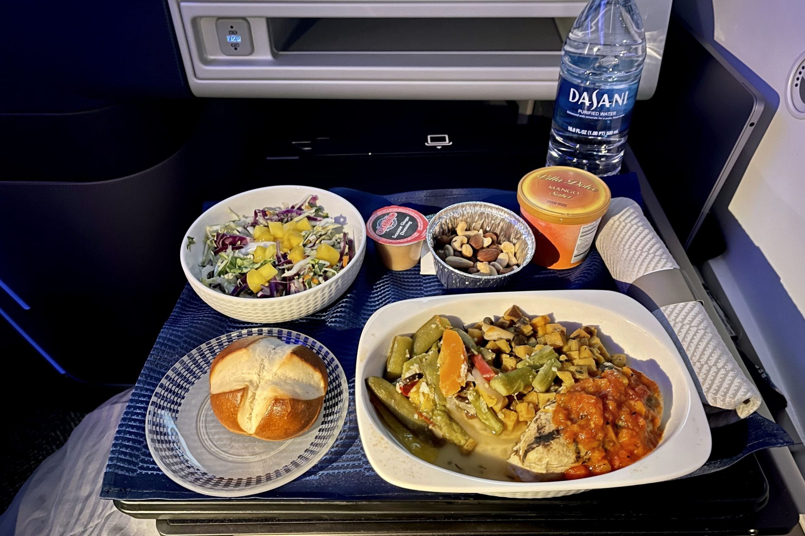 After that, it was business as usual, with dinner served wrapped and on a single tray. We had a choice of "beef, chicken or pasta" — I went with the chicken, which tasted better than it looks. The pretzel roll was a nice surprise, too.