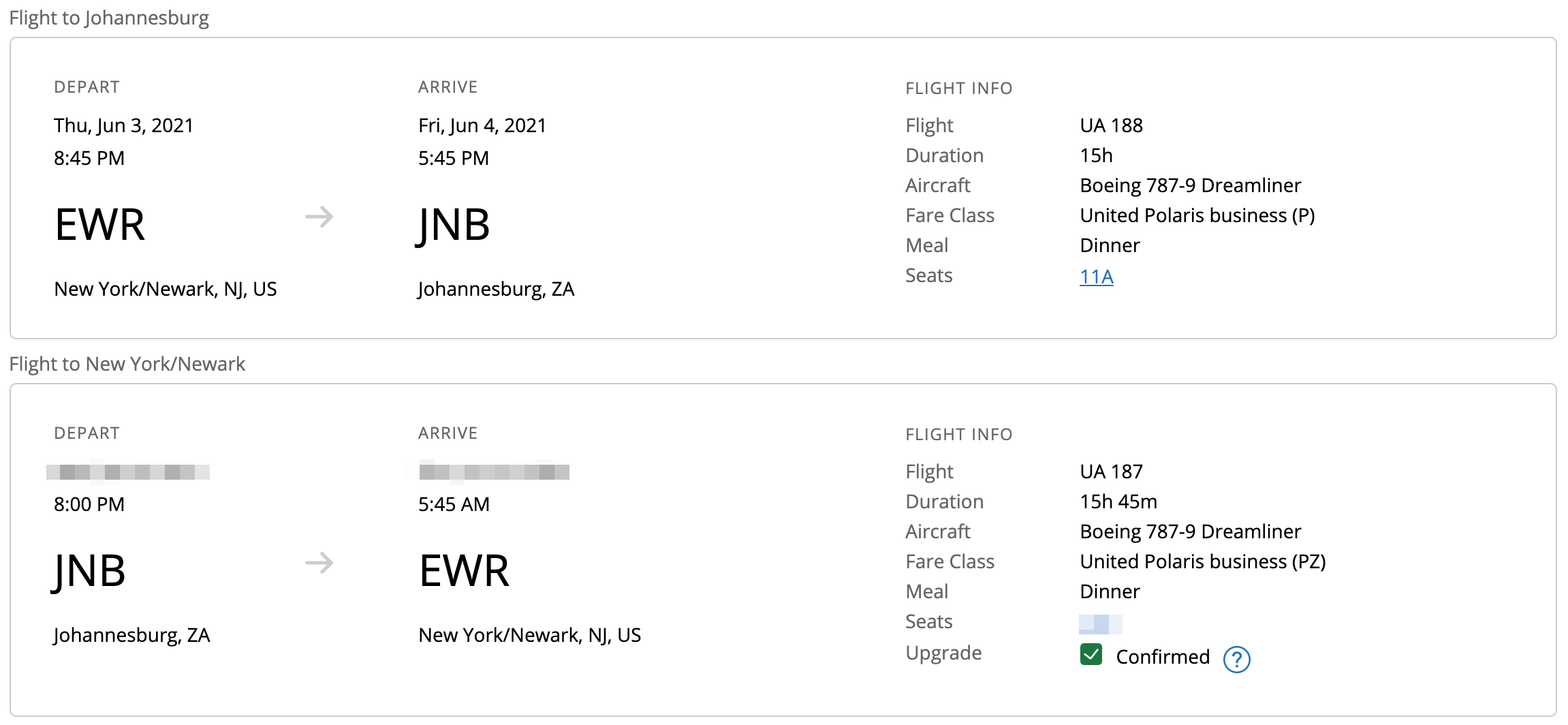 Then, once the airline decided to push back its EWR-JNB service, I booked a paid round-trip, given that business fares were low and there was upgrade availability on the return flight.