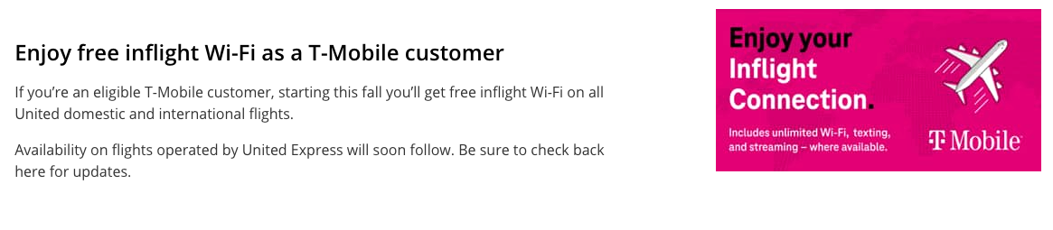 The latter two providers will not be covered under the initial partnership, though a teaser on the United website says that "if you're an eligible T-Mobile customer, starting this fall you'll get free inflight Wi-Fi on all United domestic and international flights."
