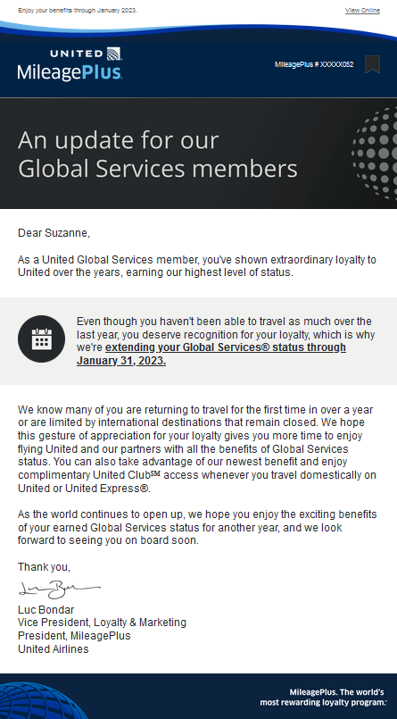 This is the second extension for Global Services members. In August of 2020, United announced that top elites who qualified based on their 2019 travels would have their benefits extended through Jan. 31, 2022, even if they weren't able to fly.