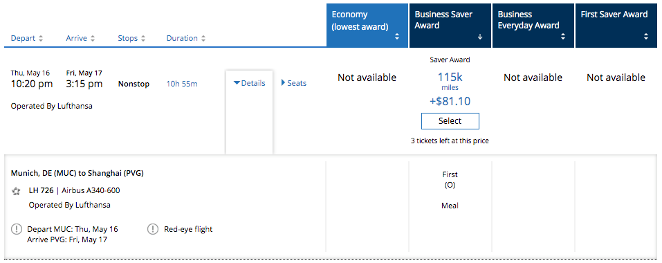 While many routes do indeed appear to be unavailable, some Lufthansa availability is popping up — albeit under the "Business Saver Award" category — such as this A340 flight between Munich (MUC) and Shanghai (PVG) for later this week.