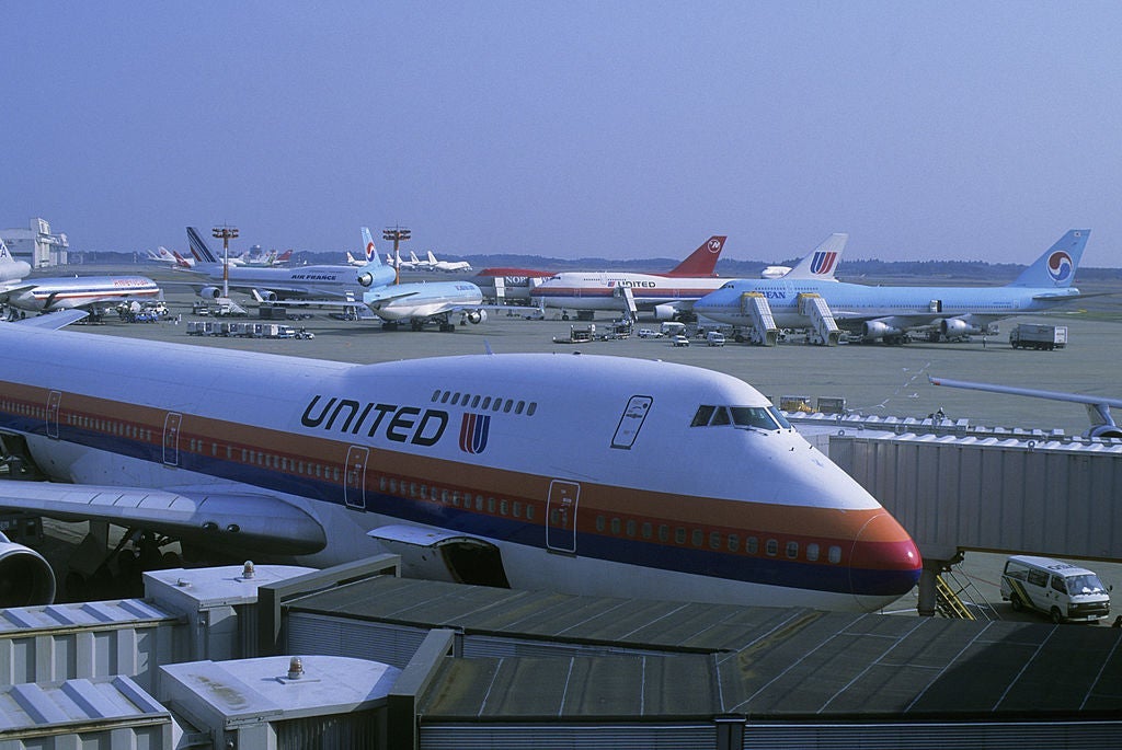 United flew this colorful orange, red and blue livery in the 90s, including in 1992, when this image was captured at Tokyo's Narita Airport (NRT).