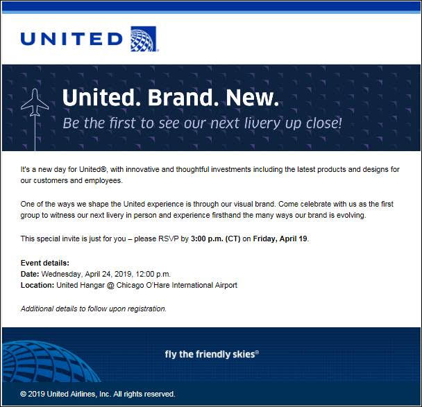 We'll know for sure next week, though. United just sent out invitations for its big livery unveiling, scheduled for Wednesday, April 24, at one of the carrier's Chicago O'Hare (ORD) hangars.