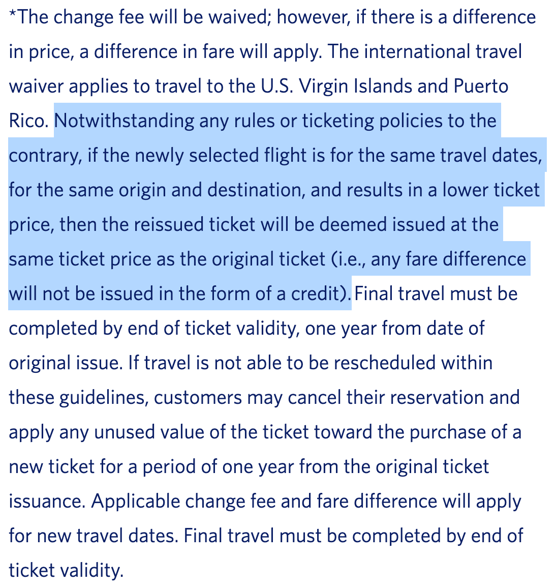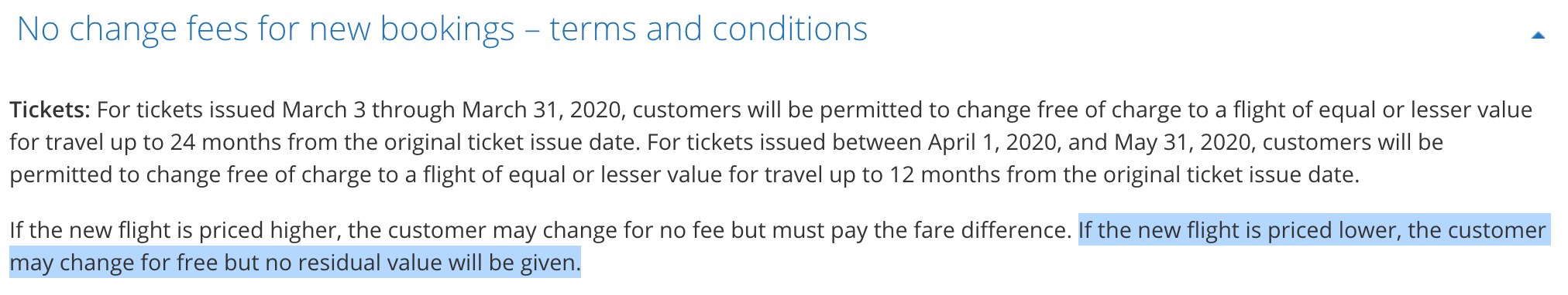 But, hidden in the terms and conditions, is a very important note I nearly missed — while changes can be made without a fee, "If the new flight is priced lower... no residual value will be given."