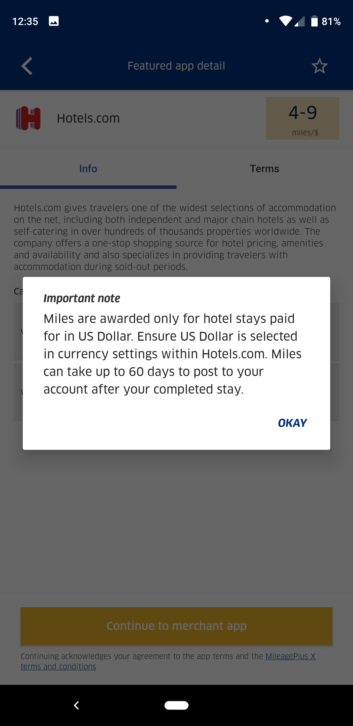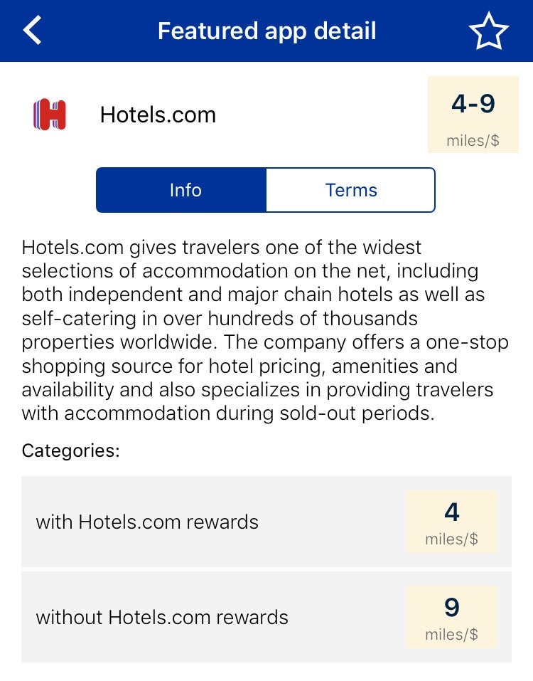 For Hotels.com, only purchases made through the Hotels.com app within the MPX app will count toward bonus United miles. You'll earn 4 miles/dollar on bookings that earn Hotels.com Rewards, which are worth one free night for every 10 nights you book, and 9 miles/dollar on bookings that don't earn Hotels.com Rewards.
