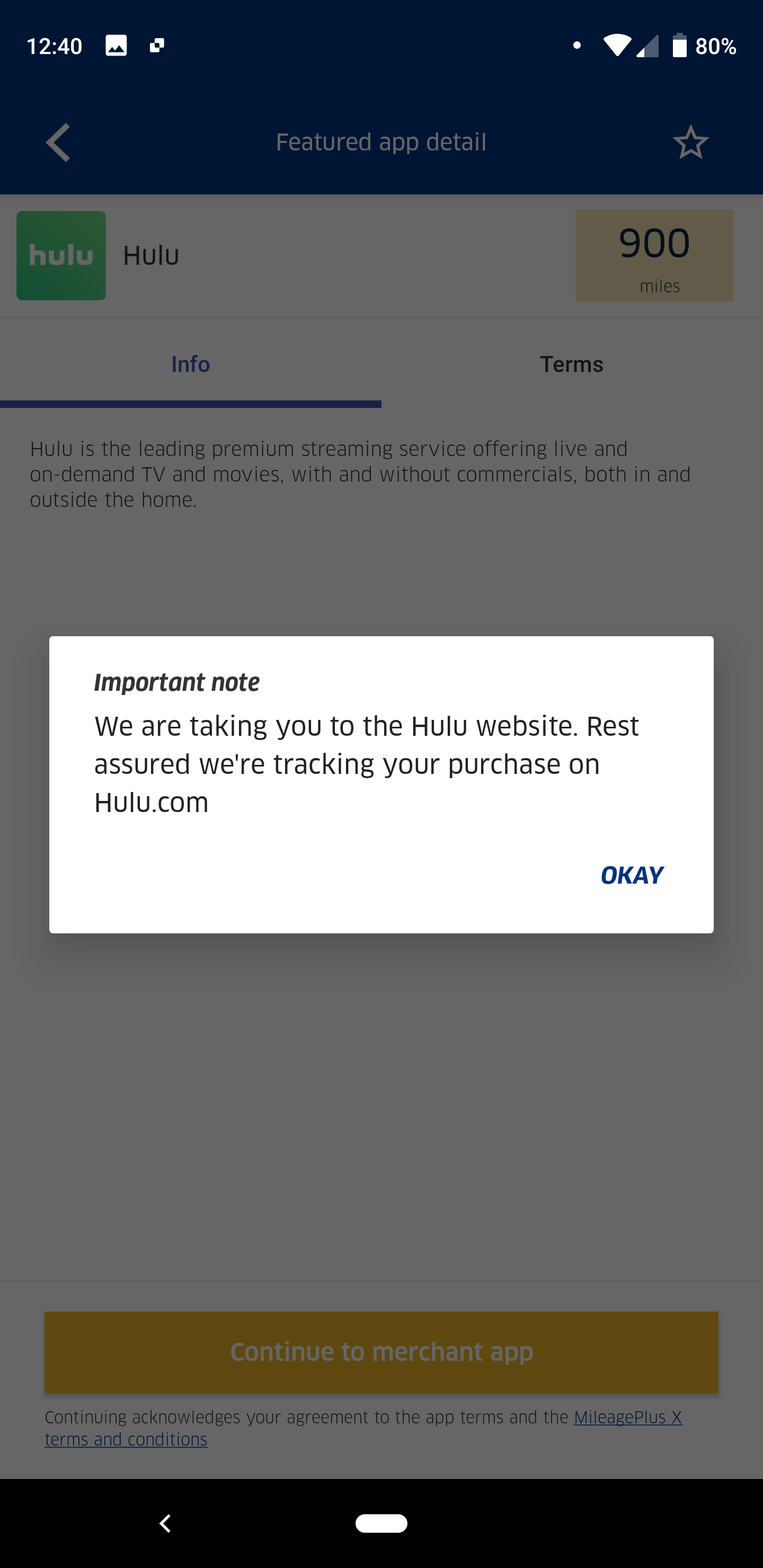 The merchant terms specify that miles can only be earned on new Hulu subscriptions; gift cards and free trials don't count toward the 900-mile bonus. Since Hulu doesn't have an app, a pop-up assures you that the MileagePlus X app will track your purchase on Hulu.com, as long as you complete the transaction within the browser window that pops up.