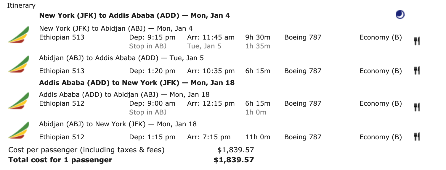In the below example, the cheapest B class round-trip coach ticket from New York to Addis Ababa costs $1,840. (For reference, the cheapest round-trip business-class ticket on these dates is around $4,500.)