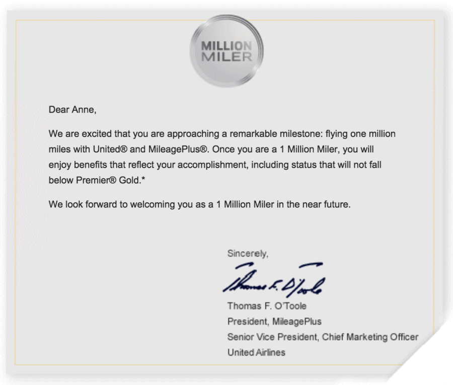 To further reinforce this point, TPG reader Anne W. passed along an email she received, as she's currently approaching the 1,000,000 mark necessary to earn Gold status for life. In addition to what's pasted above, the note clarifies that while Anne will be able to achieve a higher level with the airline, her status will never drop below Gold.