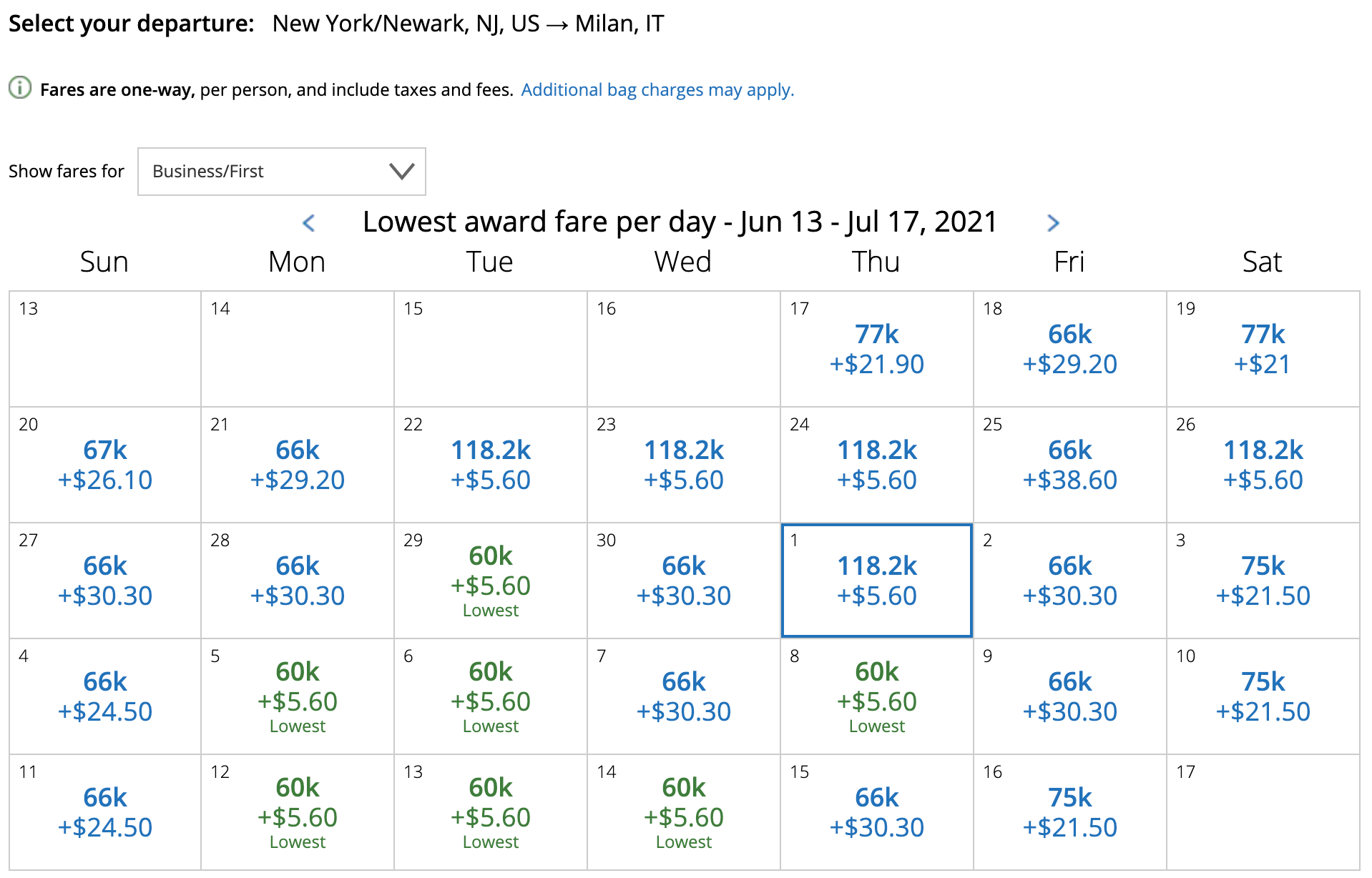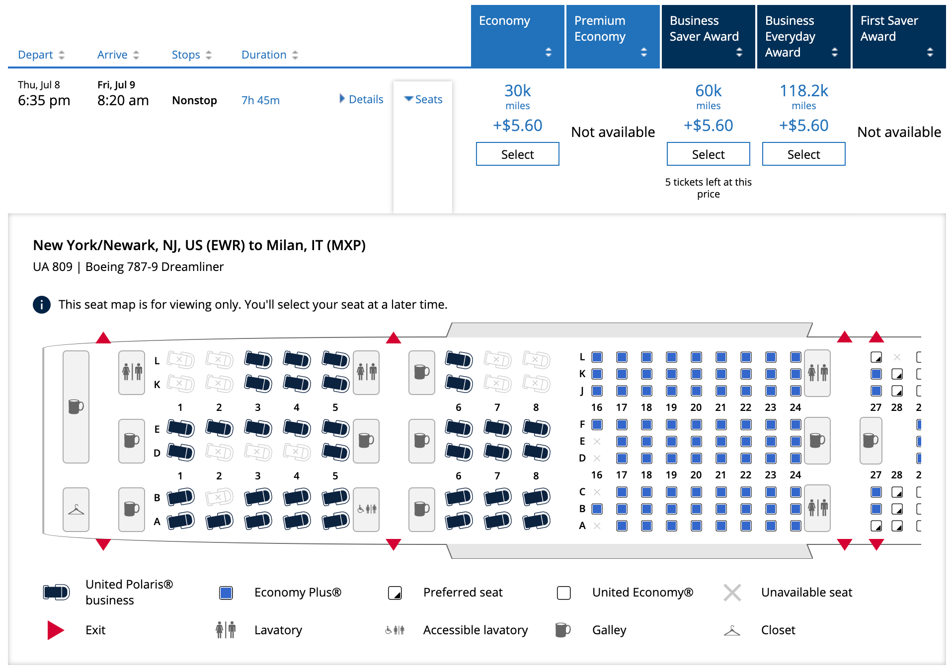 Fares to both destinations are currently priced starting around $600 round-trip for economy or $2,650 for business class. Round-trip MileagePlus awards start at 60,000 miles for economy and 120,000 miles for business class, with scattered saver availability throughout the summer.