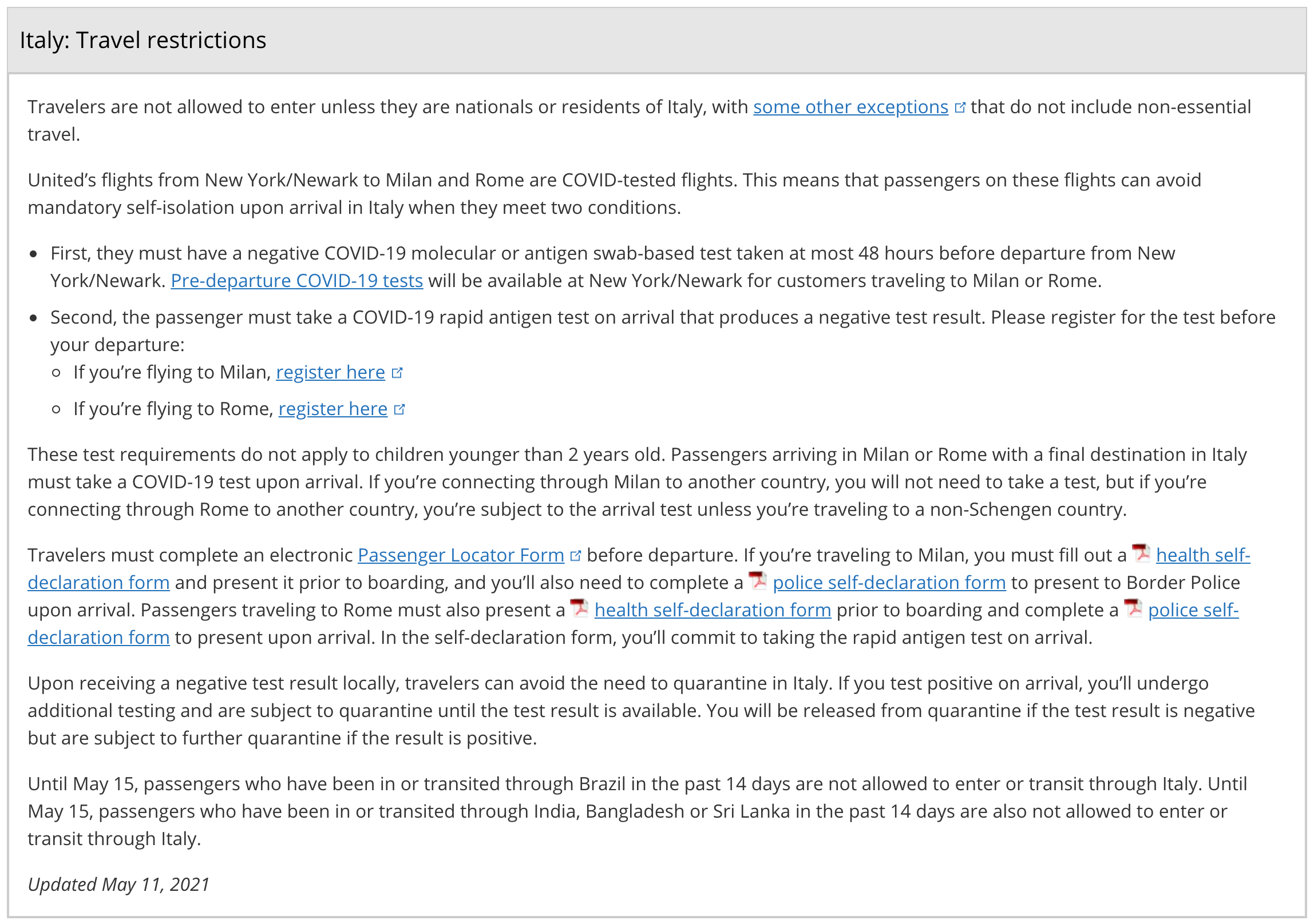 An antigen test will also be performed upon arriving in the airport in Italy — Milan passengers can register for their test here, while anyone arriving in Rome will register at this link.