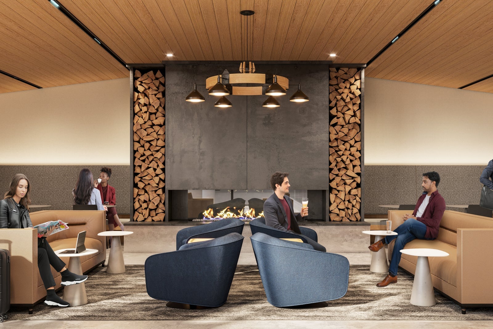 This club features two fireplaces — one on each level. A wood-filled wall display flanks the fireplaces under natural oak-lined ceilings. As you can see from this pre-opening rendering, the intent was to make it feel as though you've entered a cozy ski lodge rather than a busy airport terminal.
