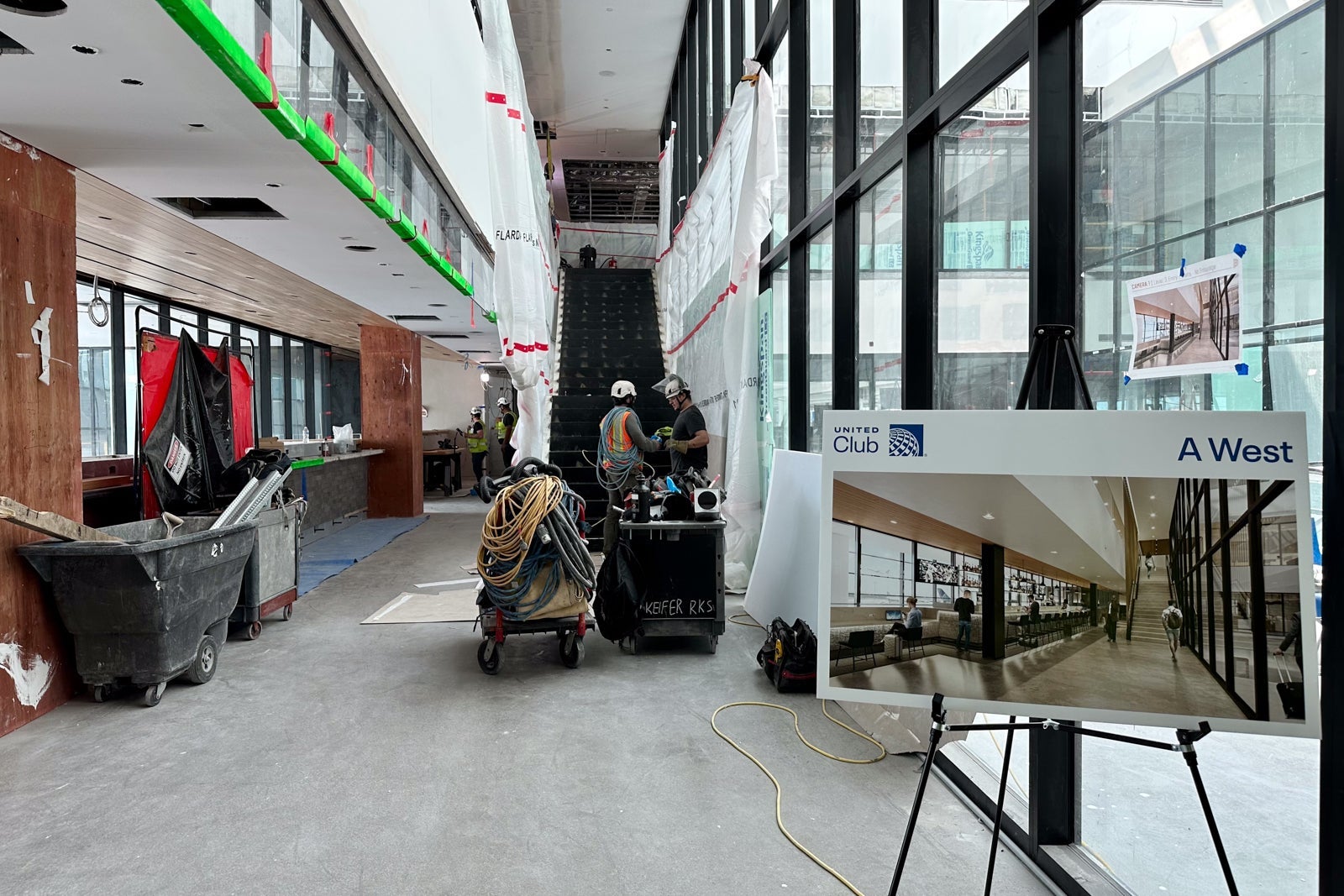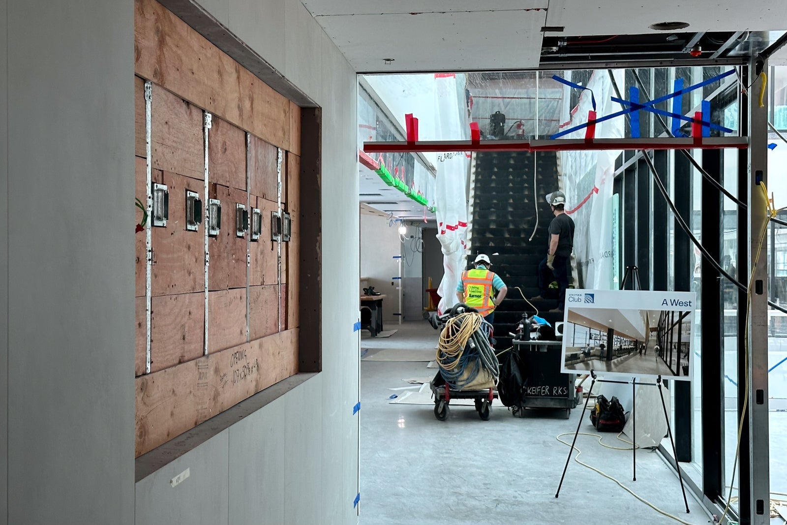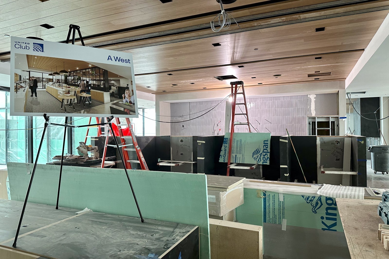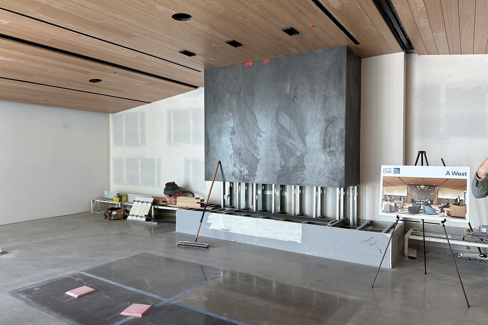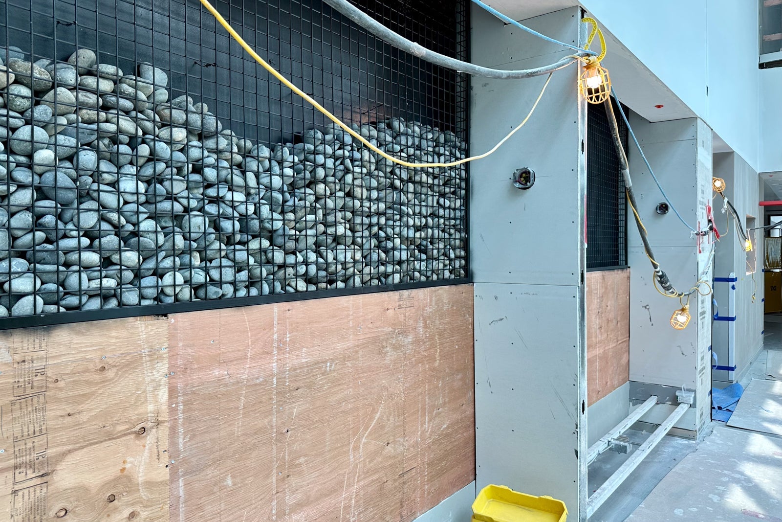 The lounge was still very much under construction when I visited in May, but you could already begin to see the Colorado inspiration. For instance, United installed gabion walls around the perimeter of the entrance hallway in a nod to the rock-filled walls that line Interstate Highway 70 to prevent boulders from falling onto the road.