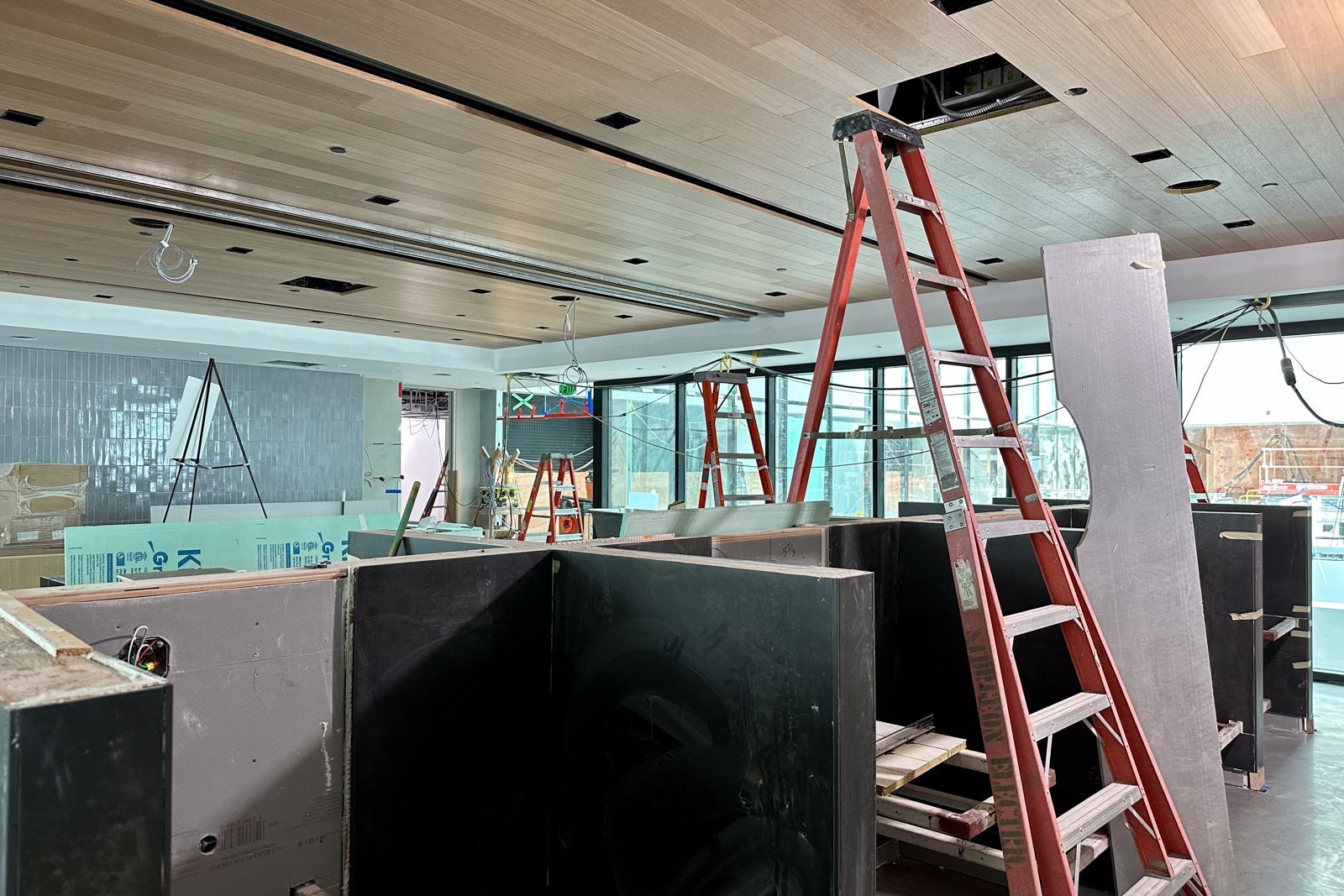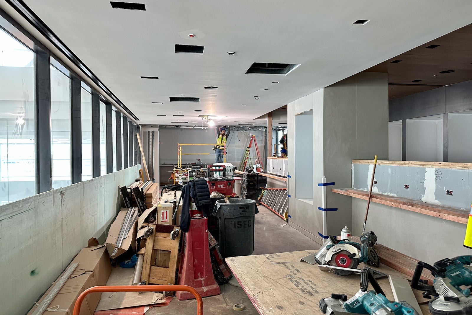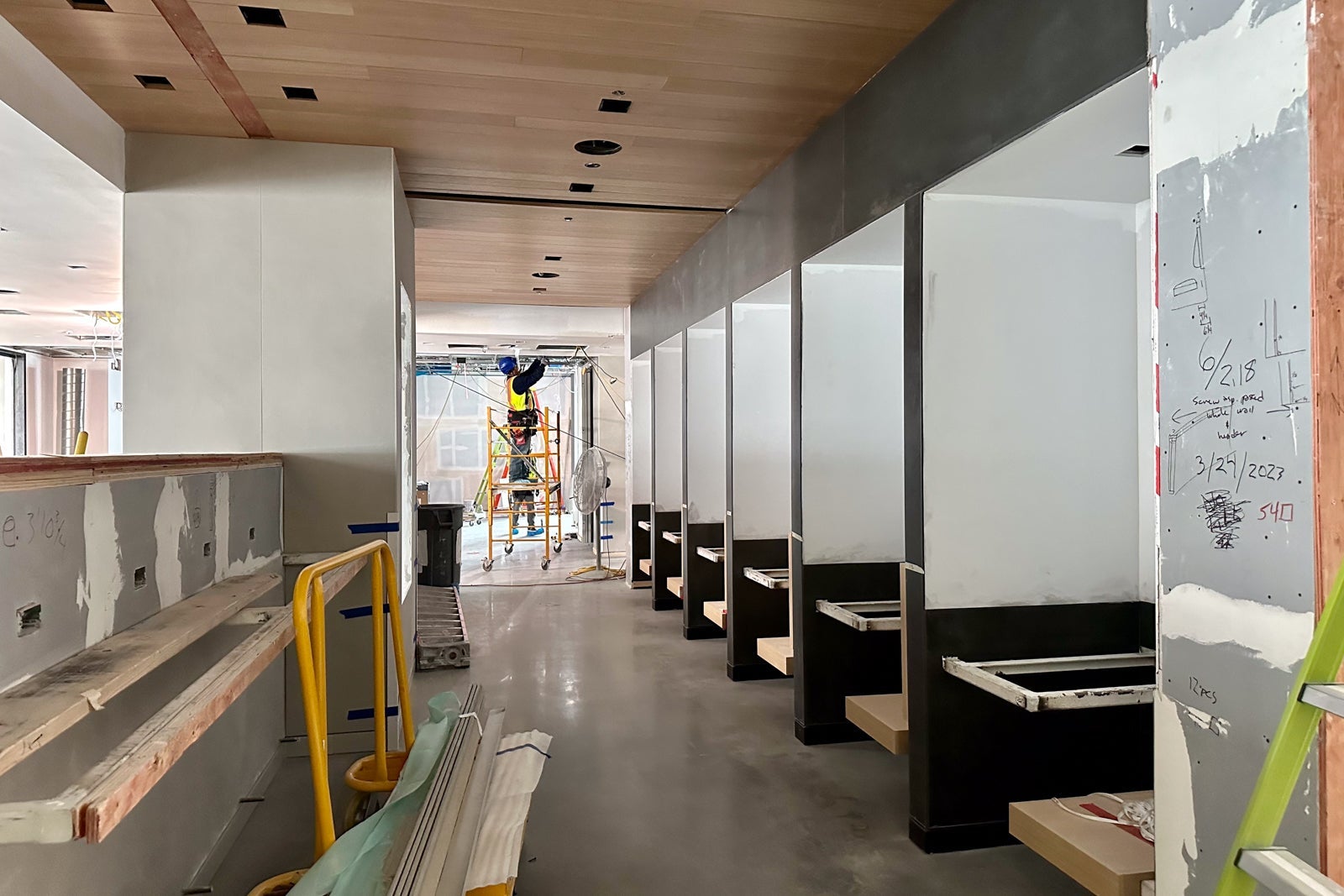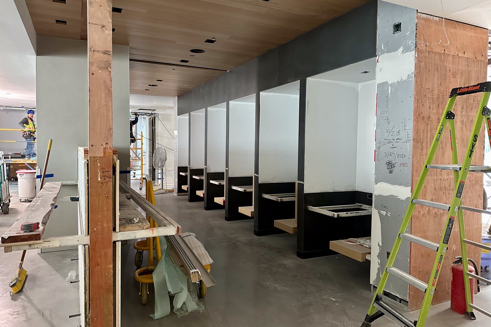 The lounge was still very much under construction when I visited in May, but you could already begin to see the Colorado inspiration. For instance, United installed gabion walls around the perimeter of the entrance hallway in a nod to the rock-filled walls that line Interstate Highway 70 to prevent boulders from falling onto the road.