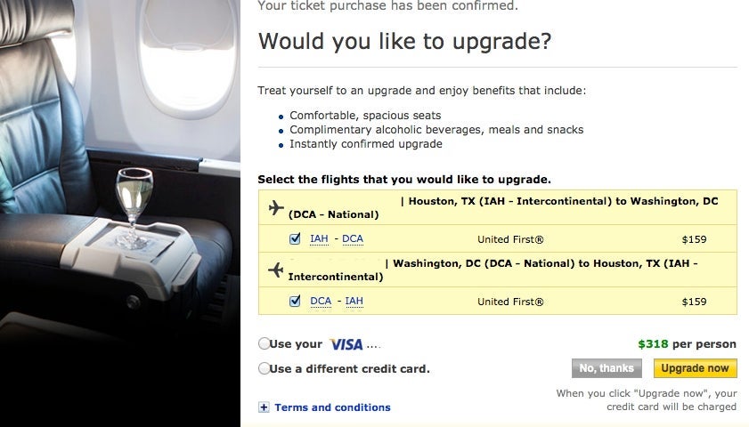 Yesterday I was helping a family member book a flight to Washington DC (I'm sure lots of you act as the 'family travel agent' as well), and after we had completed the booking we were offered the opportunity to confirm a first class seat for $159 each way. That's not an insignificant amount of money, but it certainly struck me as discounted compared to what the normal cost is to buy up to first from that fare. This was a non-elite passenger who purchased a round trip ticket from Houston to Washington DC for $379, which is actually a pretty decent price for those two markets outside of a sale or fare war.