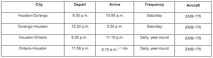 Houston will get two Embraer EMB-175 flights as well, including service to Durango, Colorado (DRO) and Ontario, California (ONT), not far from LA.