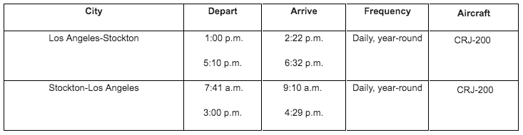Los Angeles will get one new route as well, with twice daily service enabling Stockton (SCK) flyers to connect to domestic and international flights through LAX.