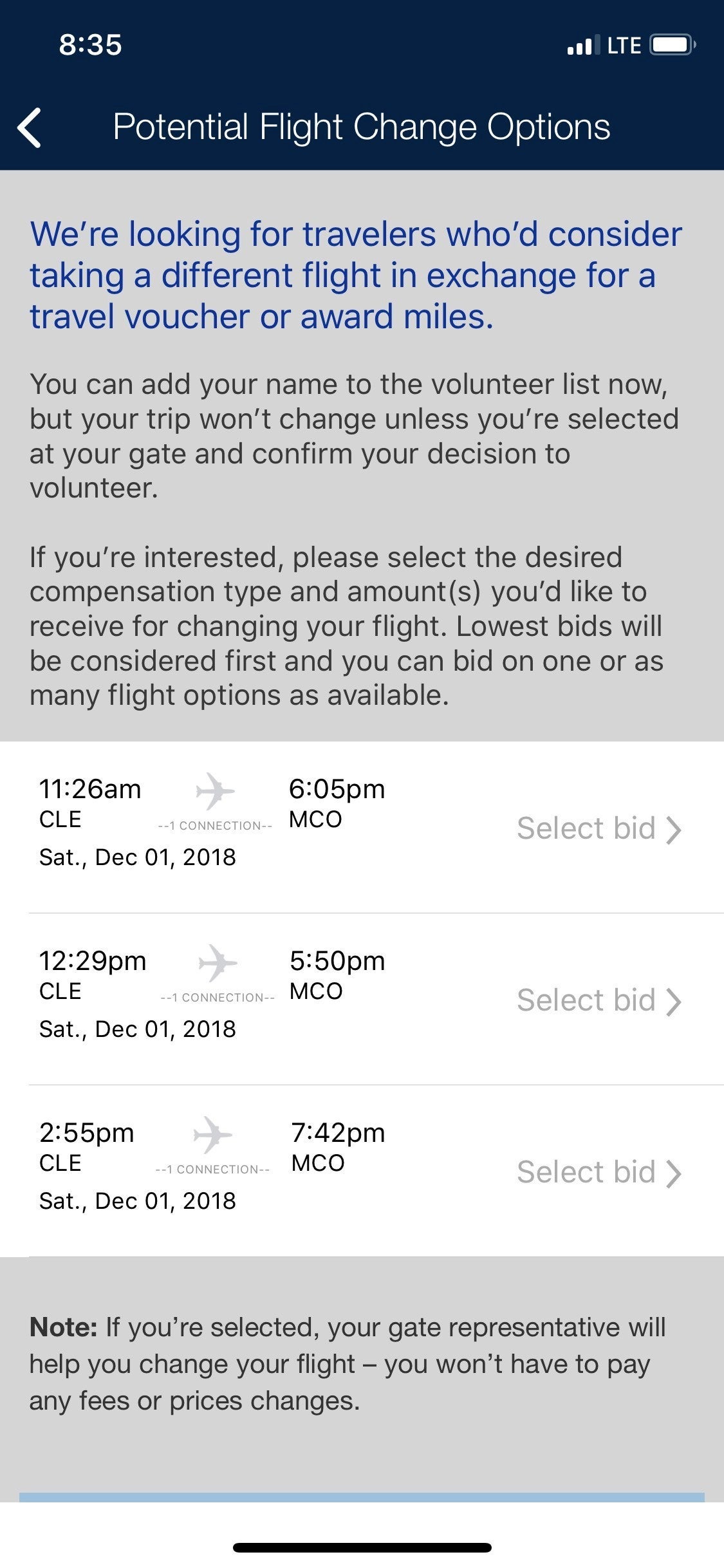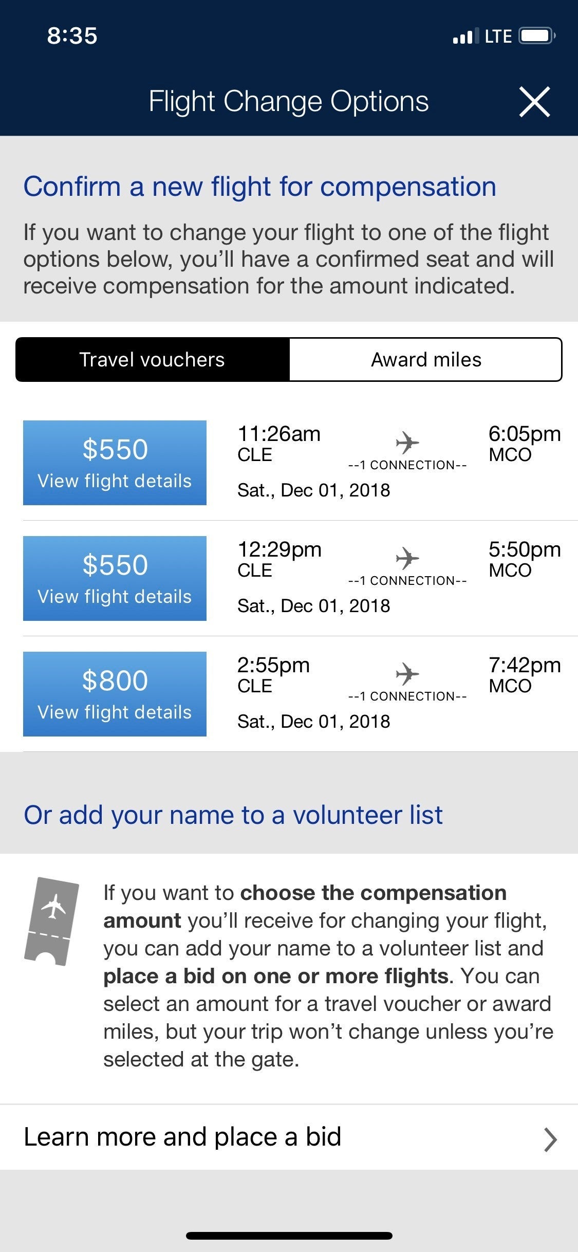 Now, customers traveling through 230 airports can pick from compensation options, and select a new confirmed flight, through the United app or on the airline's website. Depending on the flight, customers may be able to volunteer as early as 24 hours before departure, choosing compensation — be it a travel voucher or redeemable miles — and a new flight before they even head to the airport.