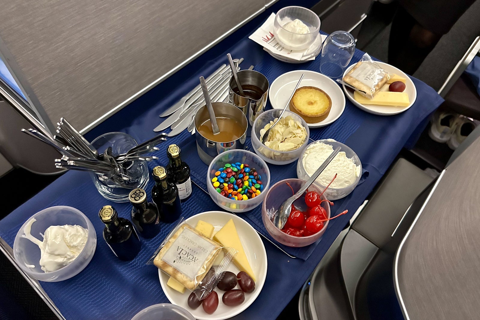 Aside from the pretzel roll, the highlight of the meal was the return of the dessert trolley, which came rolling down the aisle about 90 minutes after takeoff. United officially brought this part of its business-class dining experience back to the sky as of Feb. 1, and I was excited to experience it during week one.