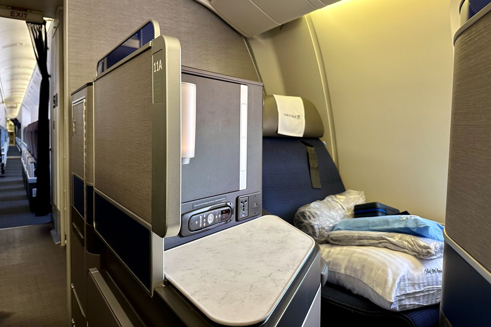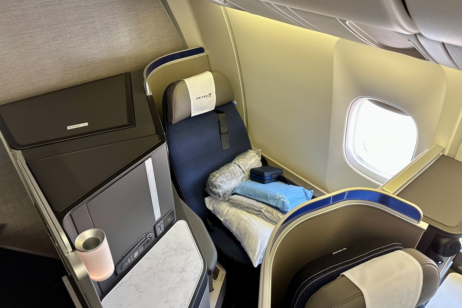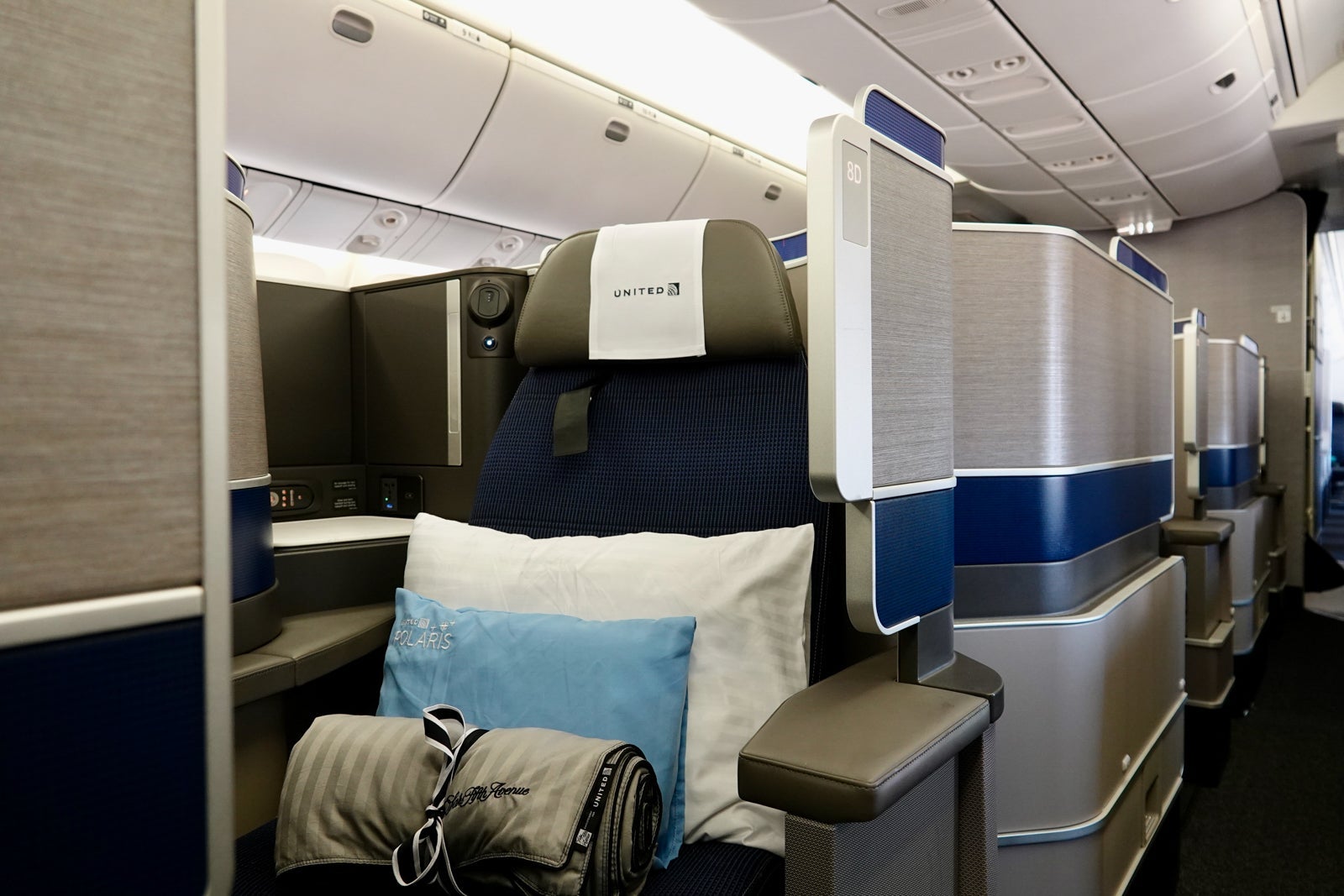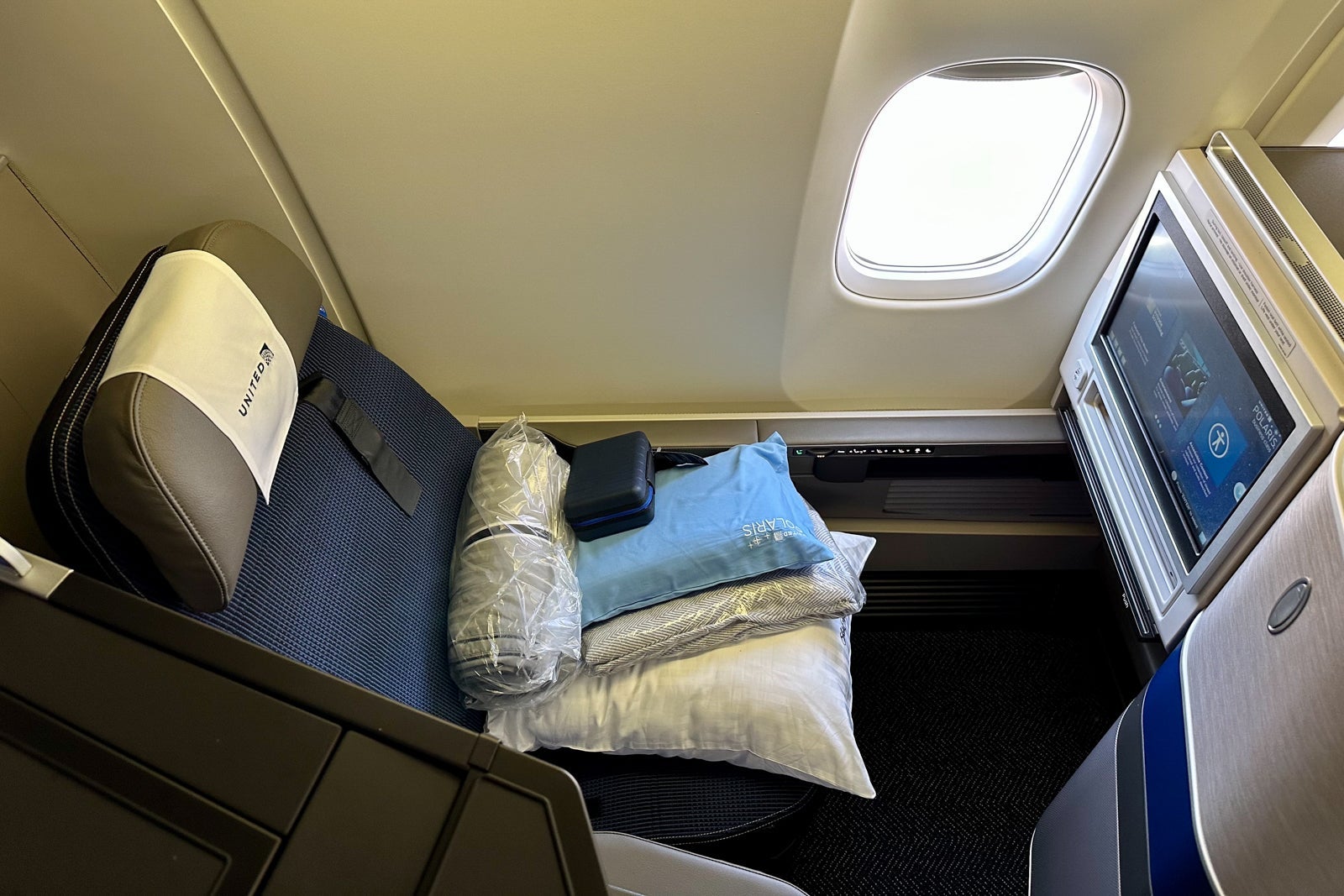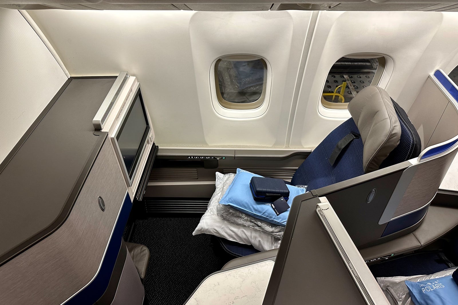 The cabin and seats themselves will likely be pretty familiar to anyone who has flown in Polaris before. (The white United-branded headrest covers were just a special treat left by the cleaning team who knew that I would be flying on this plane.)
