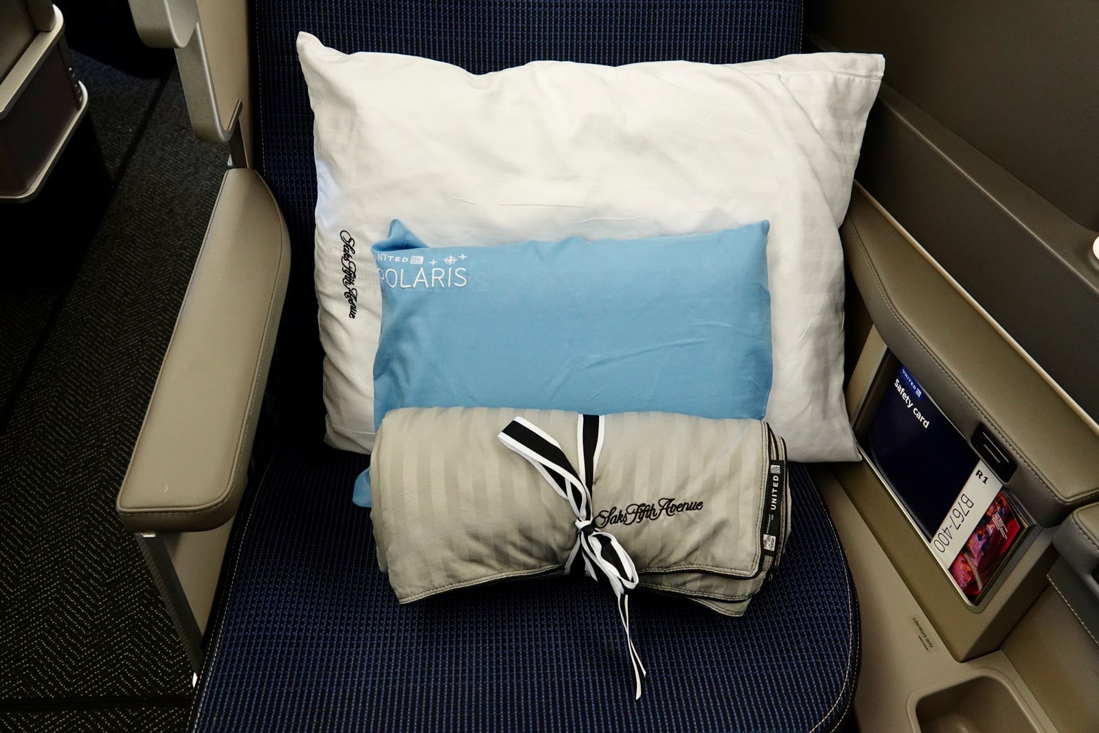 Aside from the culinary offerings, United's Polaris product is still the best of the U.S. airlines in terms of the bedding that you receive. Waiting at each seat was a Saks Fifth Avenue duvet and plush pillow, along with a gel pillow and light day blanket.