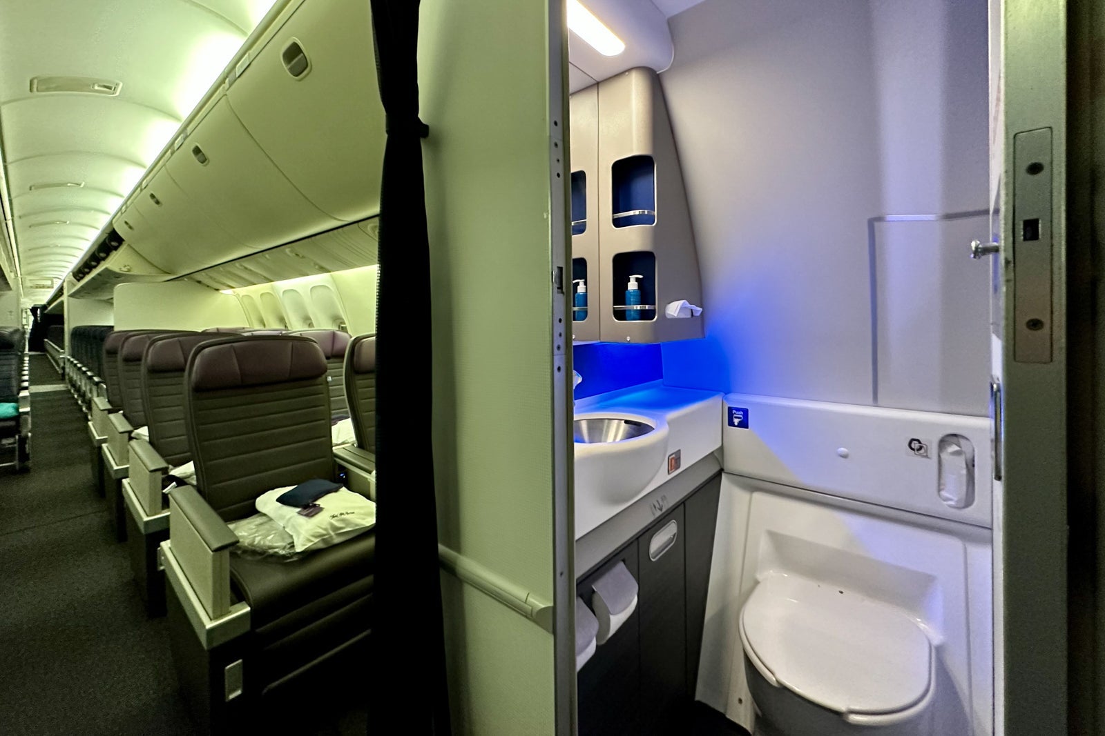 Neither restroom is oversized, and I found that the lines got quite long as people woke up during the initial descent. My 10-minute wait for a bathroom was compounded by the fact that some of the 24 Premium Plus passengers were also queuing for these two lavatories.