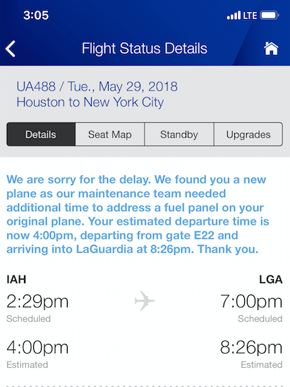 TPG noticed the change when one of our editors was flying out of Houston (IAH), she got an alert in her United app saying that crews were working to fix the Boeing 737-700's fuel panel. "We found you a new plane as our maintenance team needed additional time to a fuel panel on your original plane," the maintenance alert read.