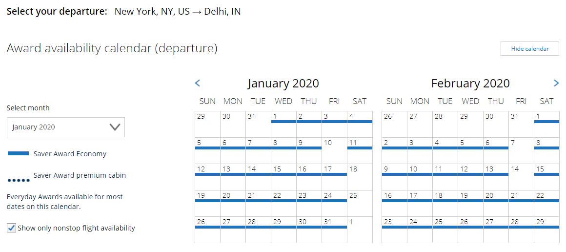 - UA 83 -- New Delhi (DEL) 11:35pm departure ⇒ Newark (EWR) 4:55am arrival +1 day