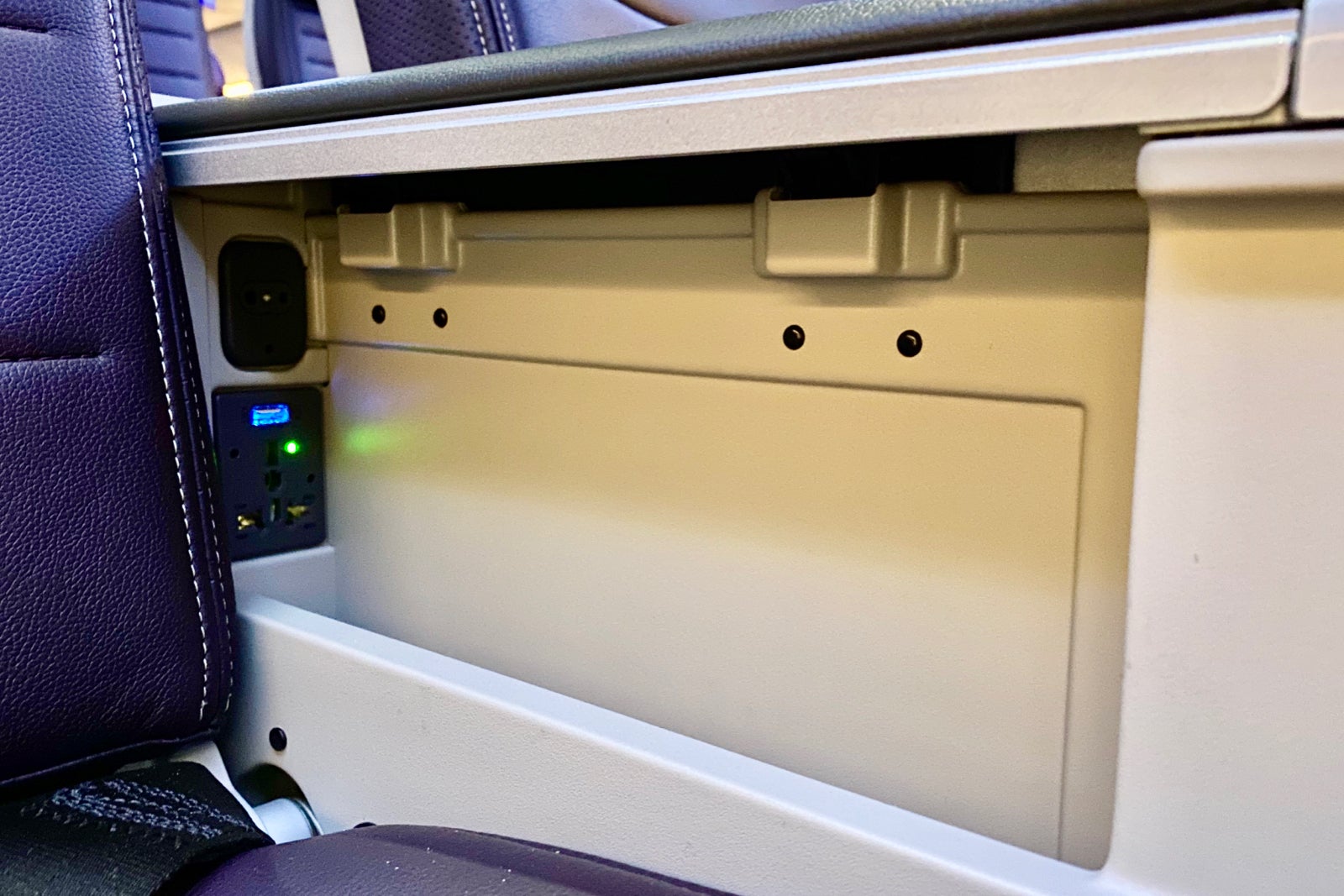 In terms of seat features, there's the familiar 15.4-inch IFE screen, enclosed storage compartment, AC outlet and two USB ports.