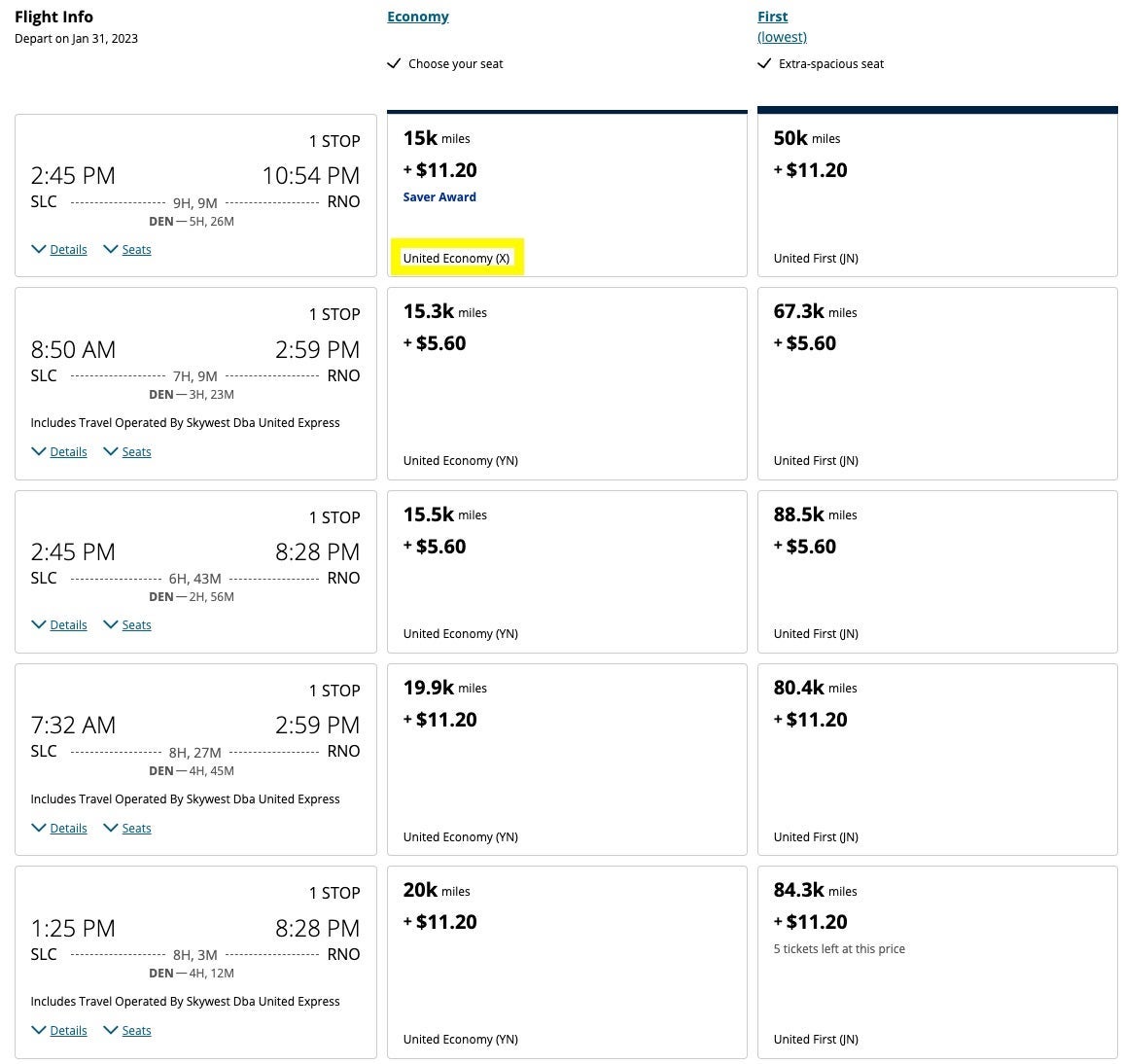 For example, here are the search results for a flight between Salt Lake City and Reno while logged into my United account. As you can see, tons of Saver (XN) award flights are available.