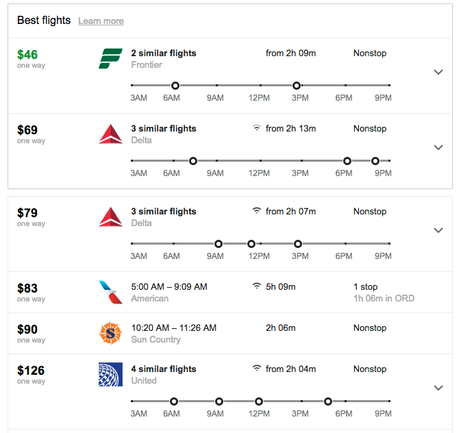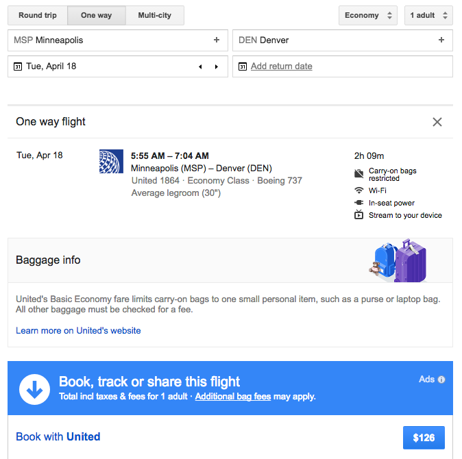 The other question is whether these Basic Economy fares, designed to compete with low-cost carriers such as Sprint and Frontier, will be lower than United's previous standard coach fares, or whether the cost of standard economy tickets will simply be increased. Additionally, it's also not clear whether United's new fares will actually be competitive with the low-cost carriers. While it's not a fair comparison since United is only flying Basic Economy on hub routes at the moment, here's a quick glance at all the airlines flying one-way from Minneapolis to Denver on April 18, the first day of United Basic Economy...