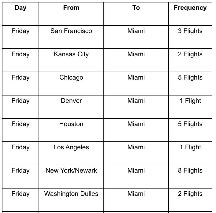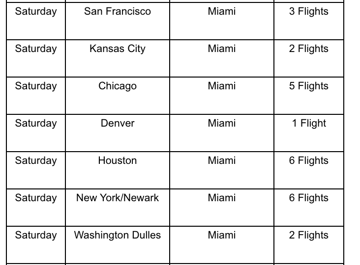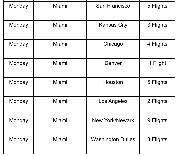 United added 29 flights in total, most of them from its hub cities including Newark (EWR), Chicago (ORD), Washington-Dulles (IAD), San Francisco (SFO) and more. And, predictably, United's adding nonstops from Kansas City (MCI) down to Miami, which is certainly an atypical route for the carrier. The full breakdown of the additional flights and frequencies is below: