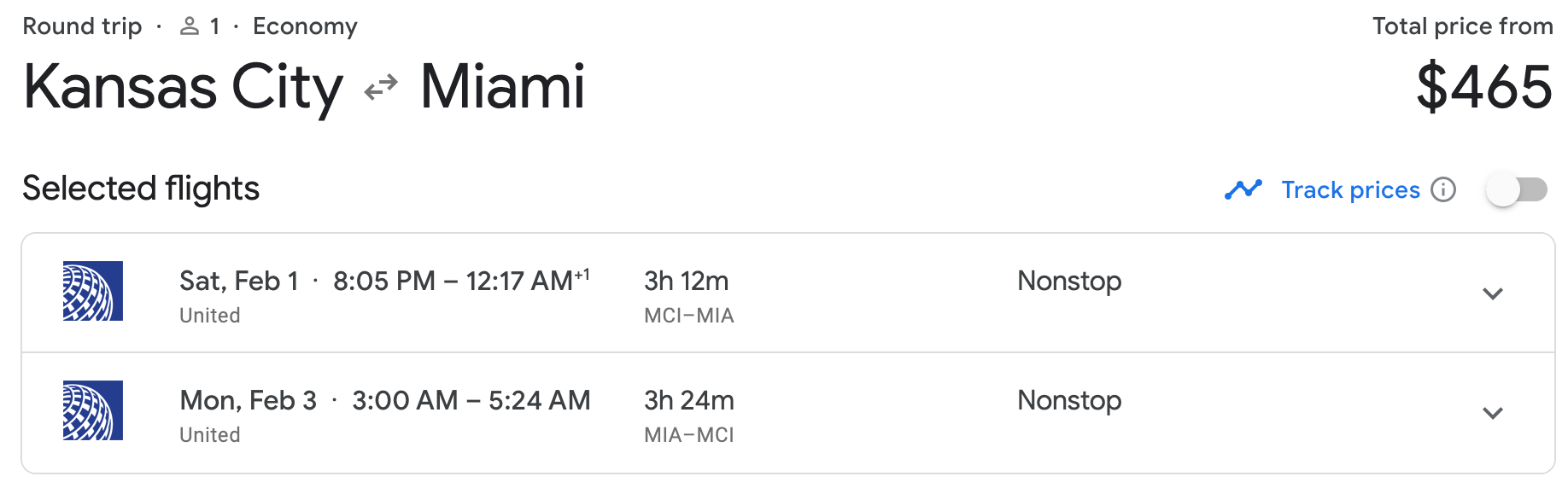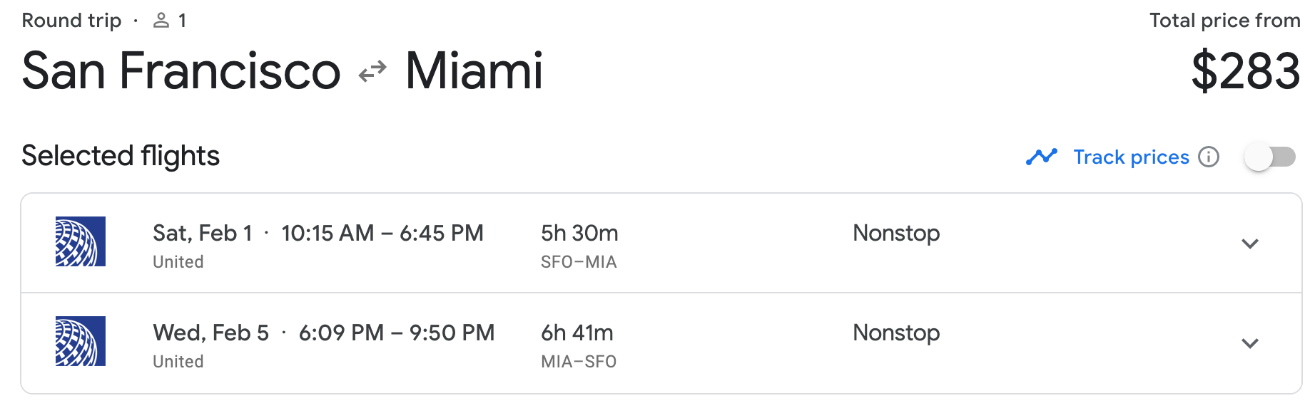 For instance, the cheapest non-stop round-trip flight from San Francisco (SFO) to Miami (MIA) is just $283. This itinerary option runs a bit past the super bowl, but depending on the outcome, 49er fans may need a few days to recoup.