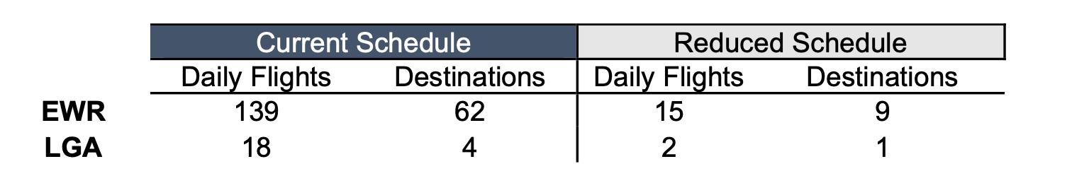 Specifically, UA is going from 139 daily flights serving 62 destinations from its mega-hub in Newark to just 15 daily flights serving nine destinations. At LaGuardia, it's going from 18 daily flights to four destinations to two daily flights serving just one destination.