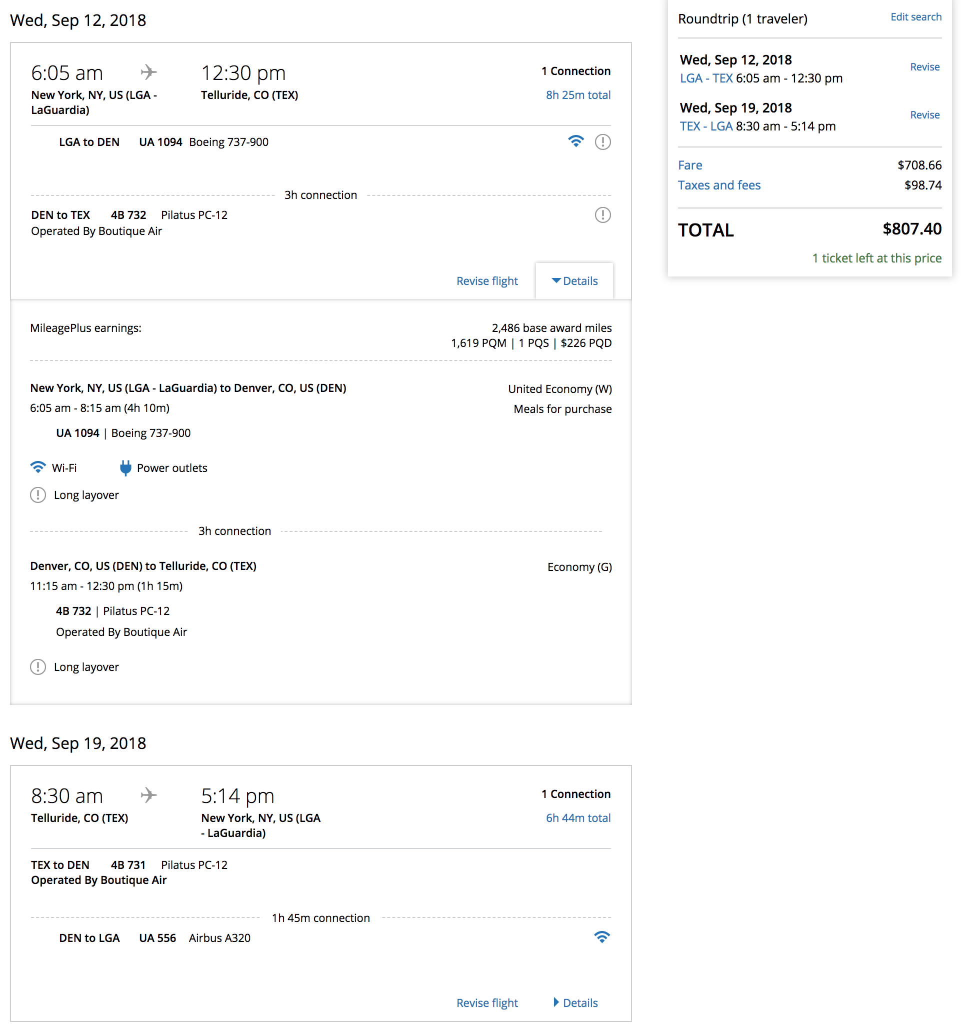 As you might expect, these connecting itineraries don't come cheap — at first I figured that had more to do with Boutique's fares, considering the same round-trip flights between New York (LGA) and Denver were pricing at $256.