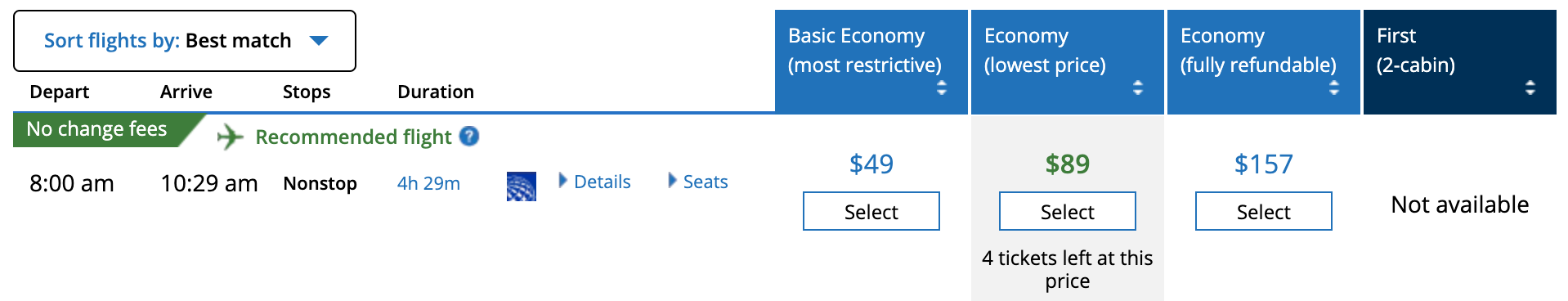 The spread was much larger on a Wednesday flight in mid-February from FLL to Newark (EWR). United was selling basic economy for $49 and regular coach for $59. The basic economy upgrade fee was $45 per person — $35 more than the fare difference between the two fare types.