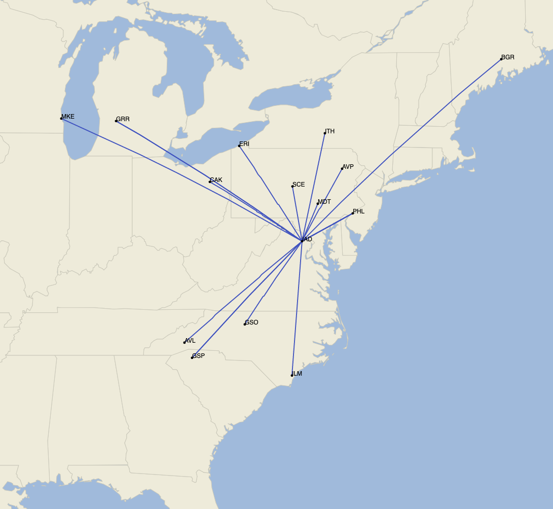 - Asheville, North Carolina (AVL) (service continues from EWR)