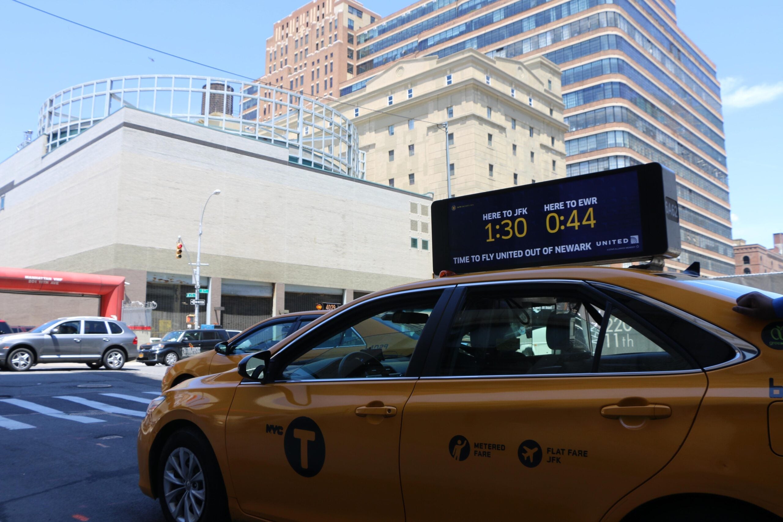 Specifically, the airline's "time to fly United out of Newark" campaign began reappearing on top of taxi cabs and at digital kiosks around the city. Nearly 3,000 screens on top of yellow cabs and at bus stations will feature a live GPS-based comparison of travel time from the current position to both John F. Kennedy International Airport (JFK) and EWR. These estimates are digitally updated in real time and vary based on current traffic.