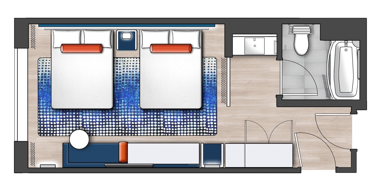 Standard guest rooms will sleep up to four and are decorated in a blue and white color scheme with otherworldly artwork.