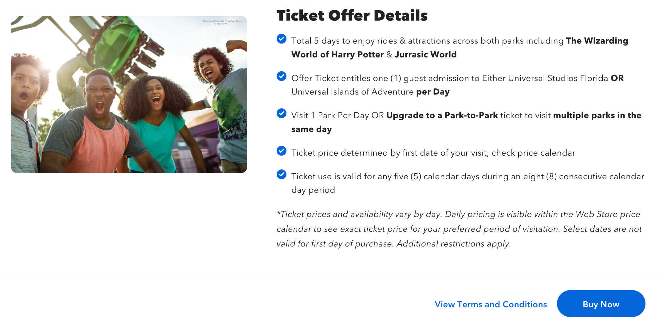 In total, consumers can use this deal to visit Universal Studios Florida and Universal Islands of Adventure for five days for the price of three days. Guests can also upgrade their tickets to include access to Volcano Bay water park for an additional $35. All rides and attractions across the two or three parks (depending on ticket type) are included in this deal, including The Wizarding World of Harry Potter and Jurrasic World VelociCoaster.